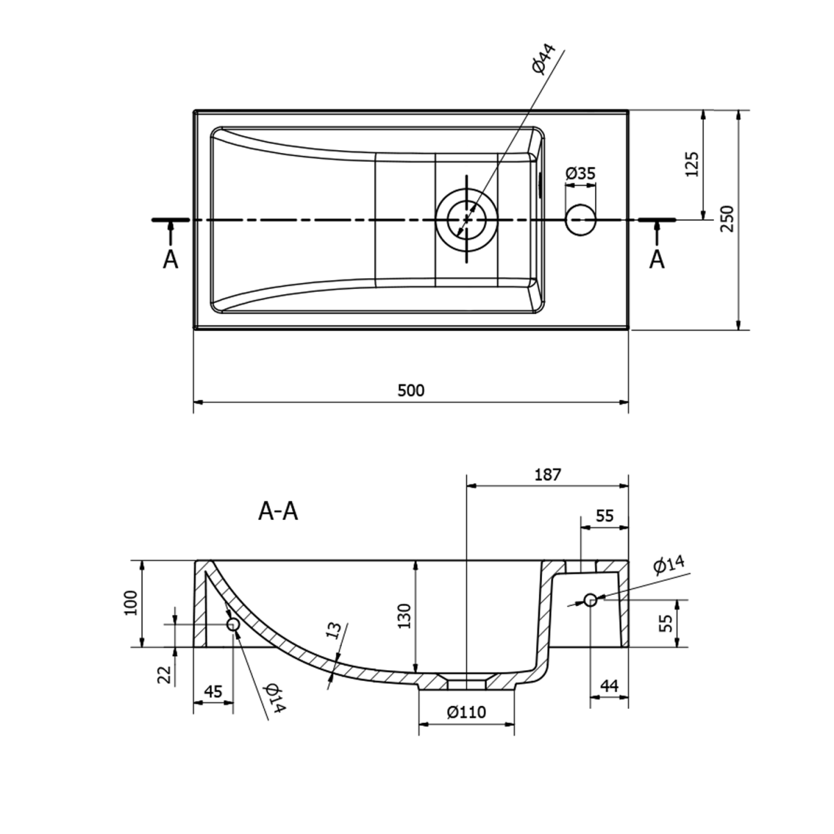 ARIANA umywalka kompozytowa 50x25cm, bateria po prawej stronie, czarny mat