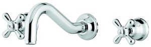 Bateria umywalkowa, podtynkowa Retro Emmevi Deco Old. Bateria umywalkowa włoskiego producenta Emmevi wykonana została w stylu Retro. Bateria umywalkowa 3-otworowa składa się z dwóch baterii sterujących z klasycznymi pokrętłami oraz wygiętej wylewki nawiązującej do starodawnych czasów. Bateria umywalkowa wykonana jest w efektownym kolorze chrom z połyskiem.
