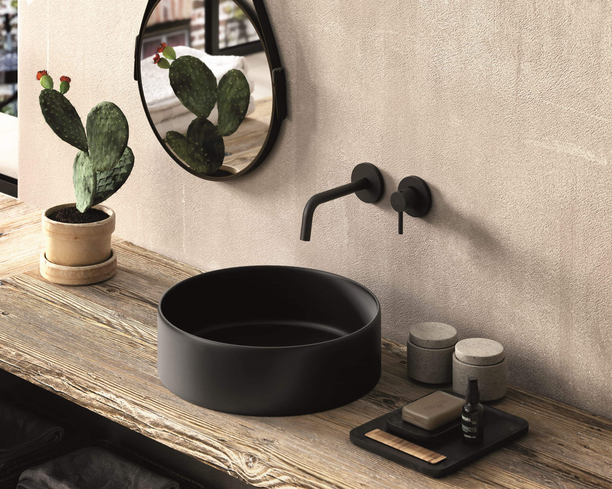 Minimalistyczny design. Czarne, matowe wykończenie i prosta forma baterii nadają łazience nowoczesny i elegancki charakter.