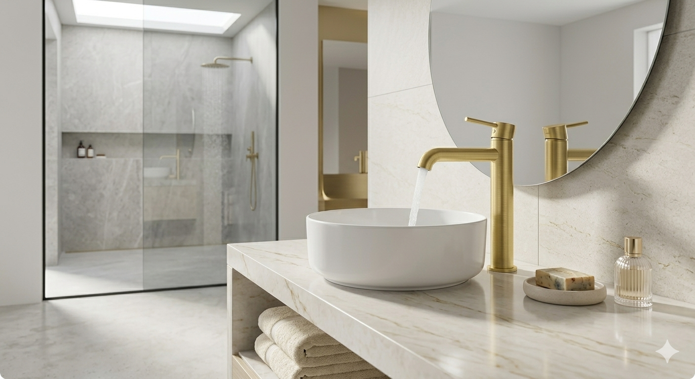 Bateria Axel QB105AGDB to model stworzony do umywalek nablatowych. Jej wysoki i smukły korpus nie tylko ułatwia codzienne mycie rąk, ale staje się główną ozdobą Twojej łazienki. Wykonana w kolorze szczotkowanego złota, łączy luksusowy blask z wyjątkową praktycznością – zapomnij o ciągłym polerowaniu smug i ciesz się nienagannym wyglądem bez wysiłku.