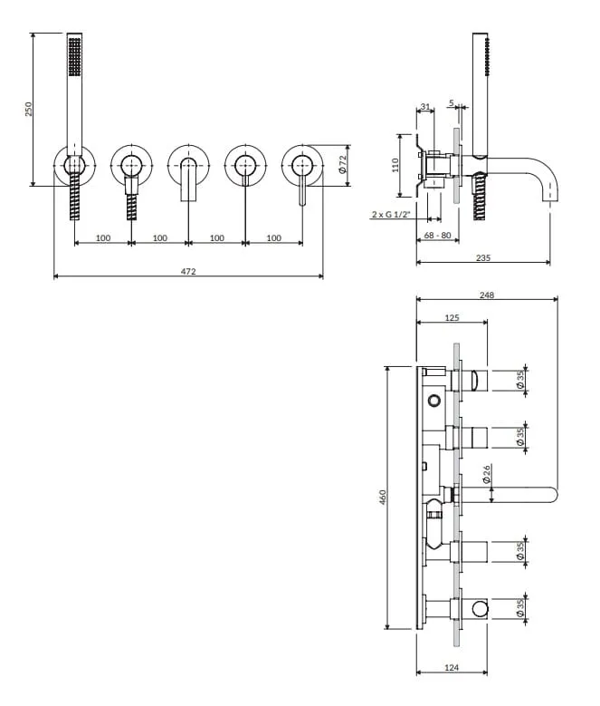 OmniresBateria wannowa, podtynkowa 5-otworowa ze słuchawką prysznicową i krótką wylewką Omnires Y1237-1SCP miedź połysk