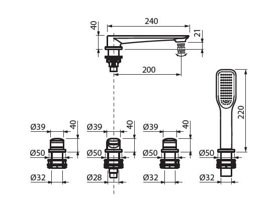 Bateria wannowa stojąca 4-otworowa ze słuchawką prysznicową i wylewką Vedo Aletta VBA5040/CZ czarny mat