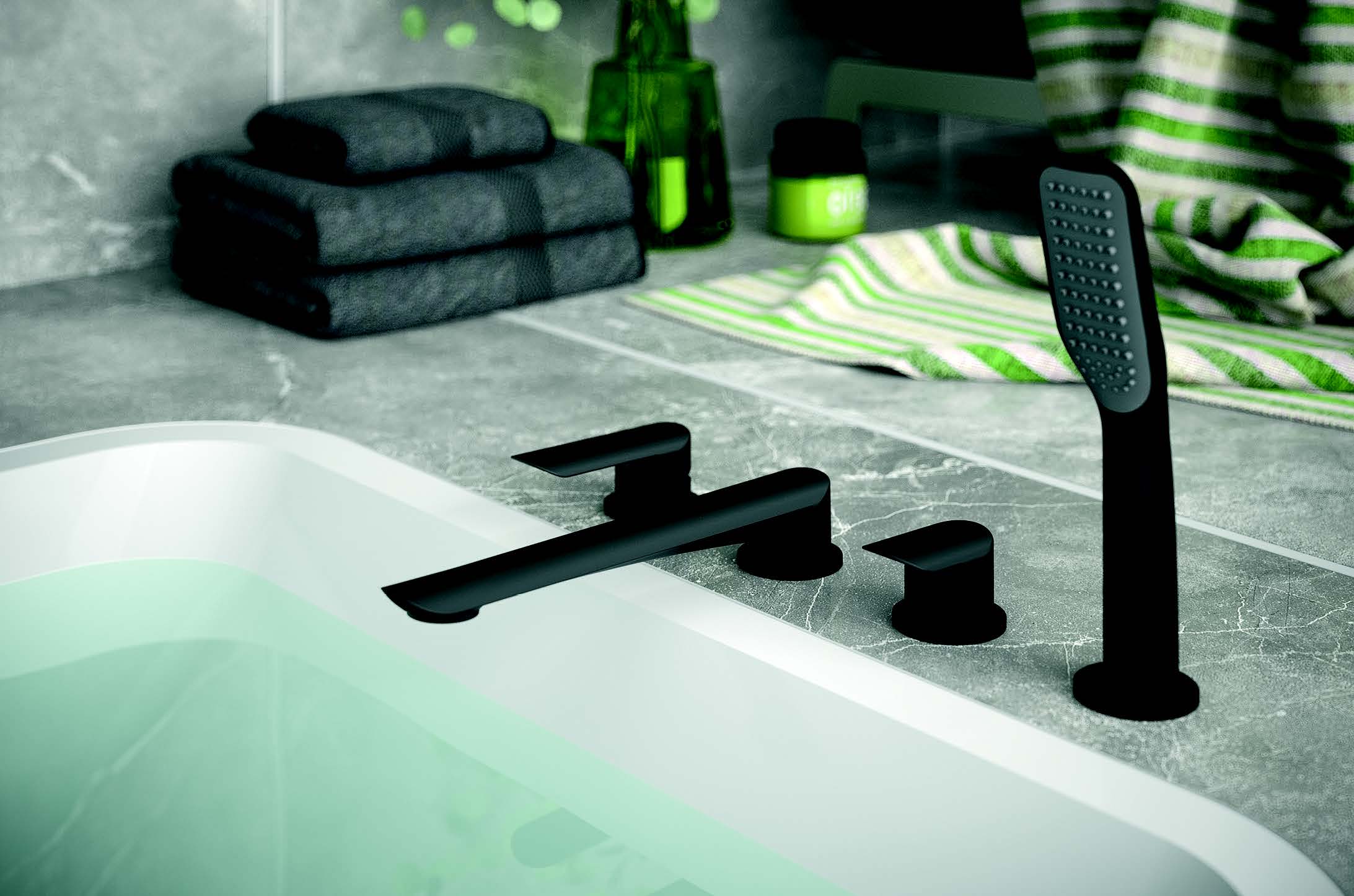 Czarna bateria wannowa 4-otworowa do montażu na wannie Vedo Aletta