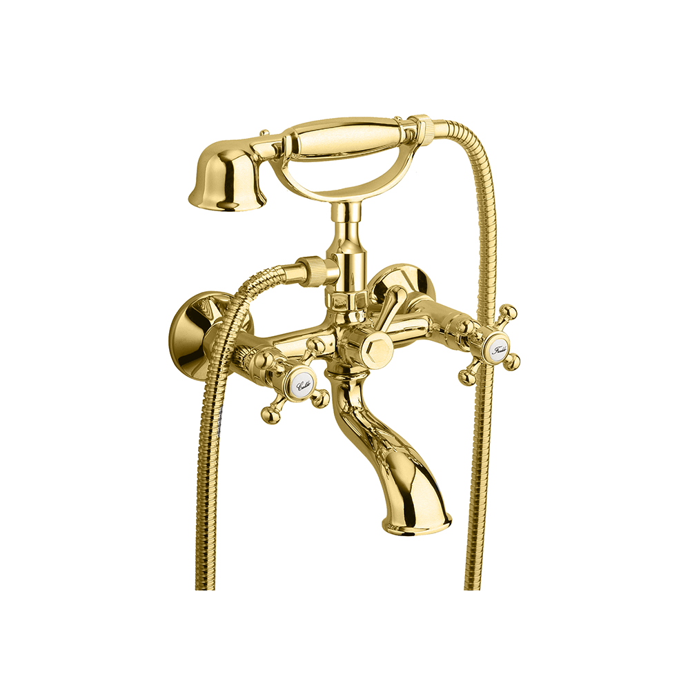 Złota bateria wannowa Retro ścienna ze słuchawką prysznicową Emmevi Laguna 40011OR