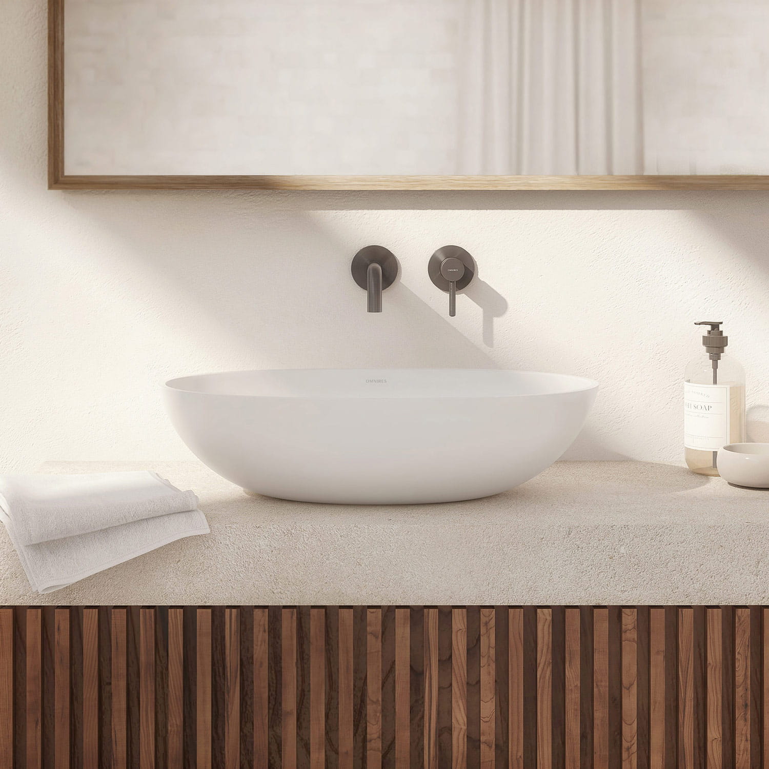 Umywalka wykonana z kompozytu. Umywalka została wykonana z wysokiej jakości kompozytu (M+), którego głównym składnikiem jest skała dolomitowa. Wykorzystanie tego materiału zapewnia wyjątkową trwałość i odporność umywalki na uszkodzenia i odbarwienia.