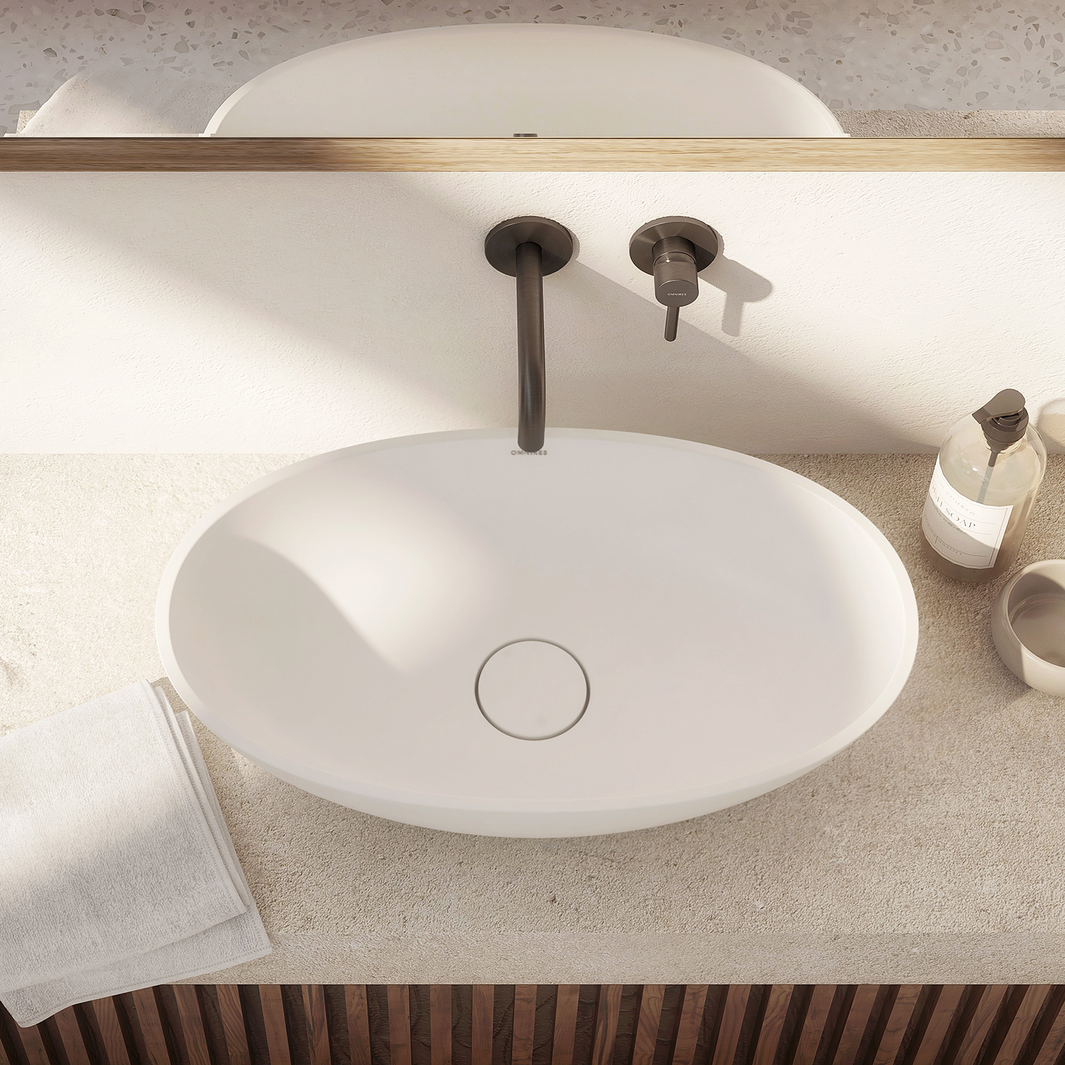 Biała umywalka nablatowa! Umywalka na blat charakteryzuje się współczesną eliptyczną formą, delikatnie zwężaną ku dołowi. Minimalistyczna bryła wygląda lekko, dzięki miękkim liniom. Świetnie dopasowana maskownica przykrywa odpływ nie zakłócając formy umywalki.