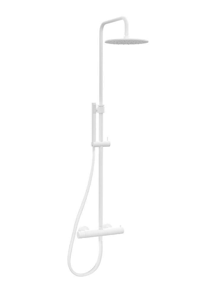 Biała kolumna prysznicowa z okrągłą deszczownicą 22,5 cm, słuchawką prysznicową i baterią termostatyczną Paffoni ZCOL638LIQBO biały mat