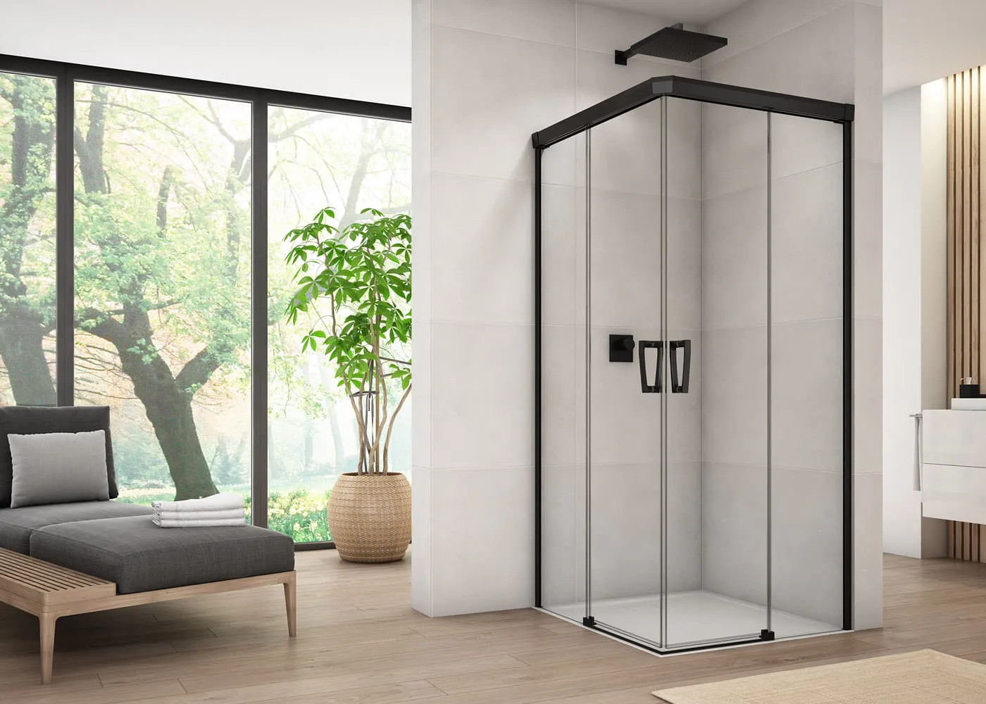 Drzwi rozsuwane z elementem stałym. Kabina prysznicowa Cadura składa się z dwóch par drzwi prysznicowych rozsuwanych z wejściem z narożnika. Drzwi prysznicowe rozsuwane posiadają element stały.