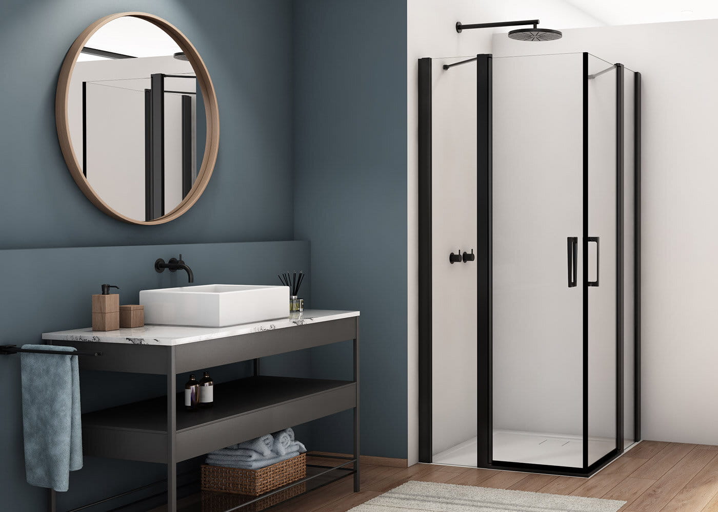 Czarne elementy konstrukcji. Elementy konstrukcji kabiny prysznicowej, takie jak profile i uchwyty są wykonane w kolorze czarny mat. W serii Divera występuje również kabina prysznicowa ze srebrnymi elementami w połysku.