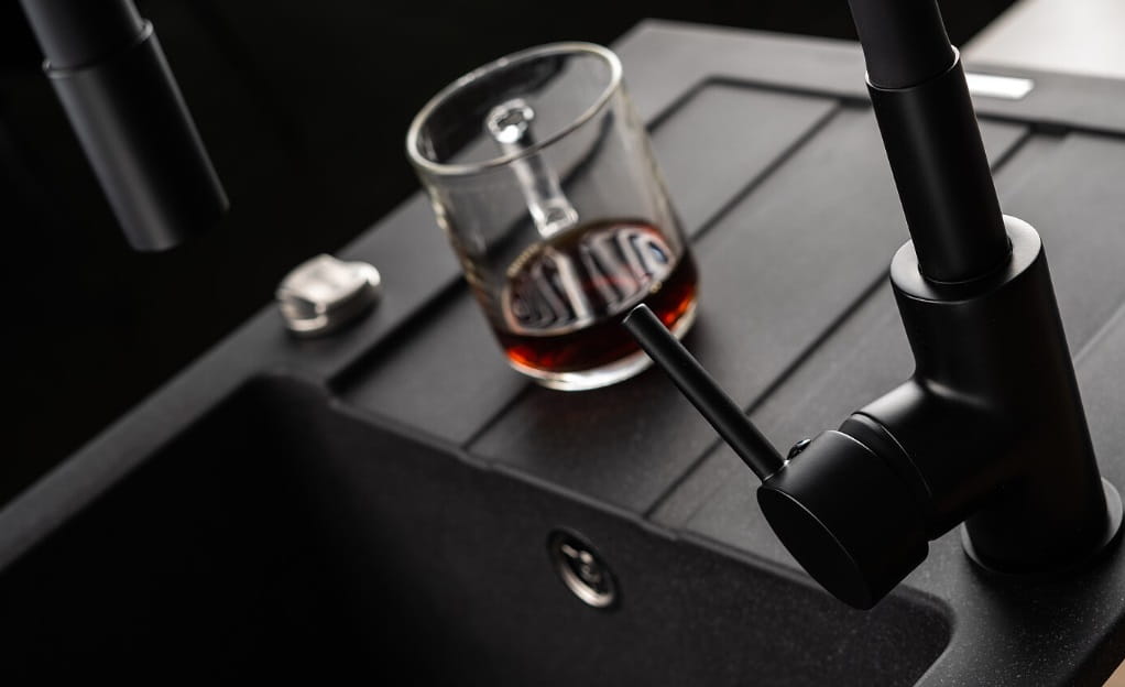 Czarny zlewozmywak granitowy 62x50 cm z czarną baterią Flessi Black Edition 1B 1D Pyramis Mido 070088401FB