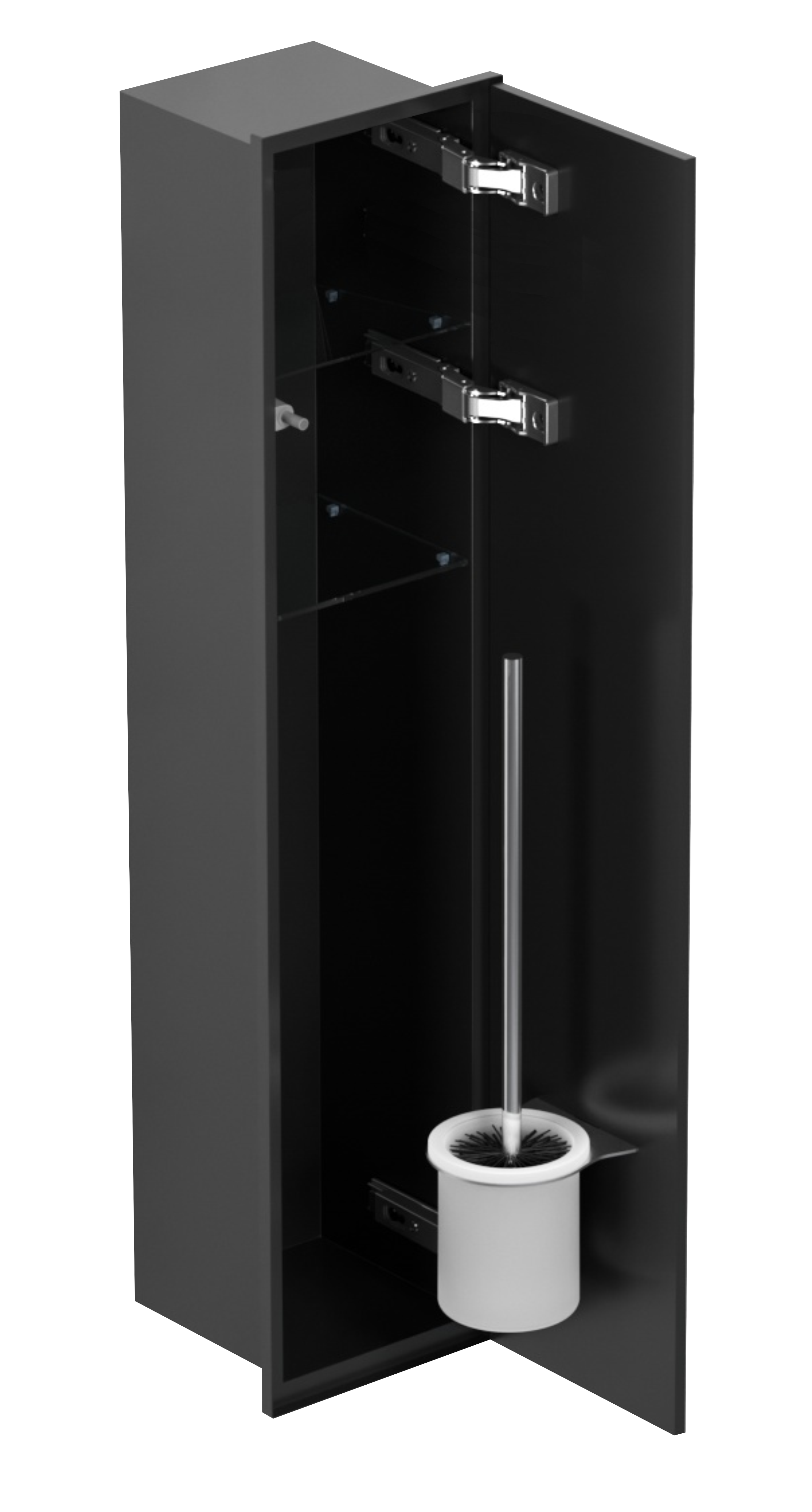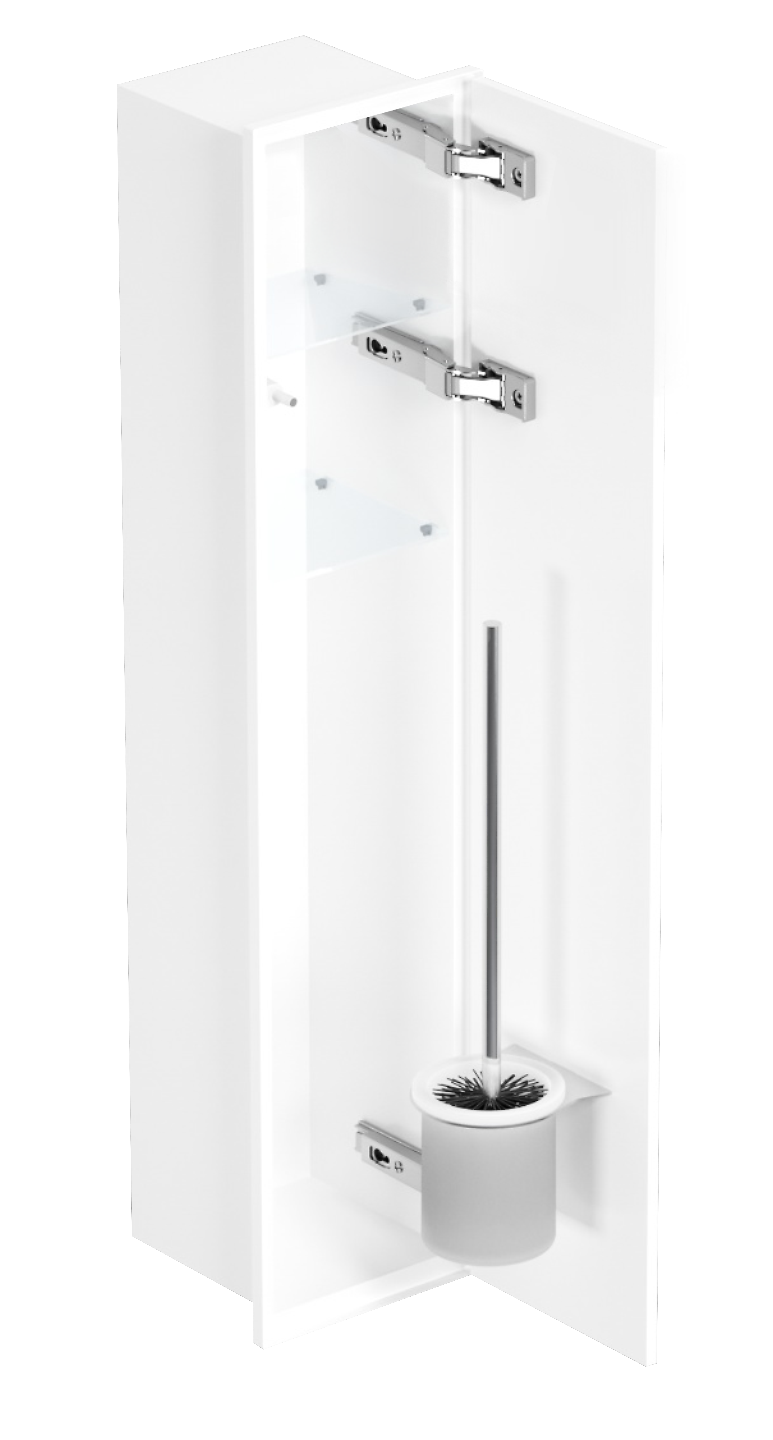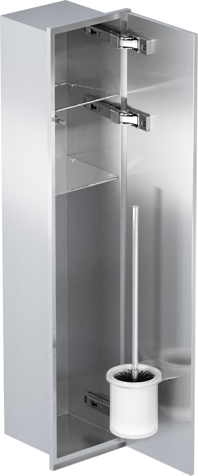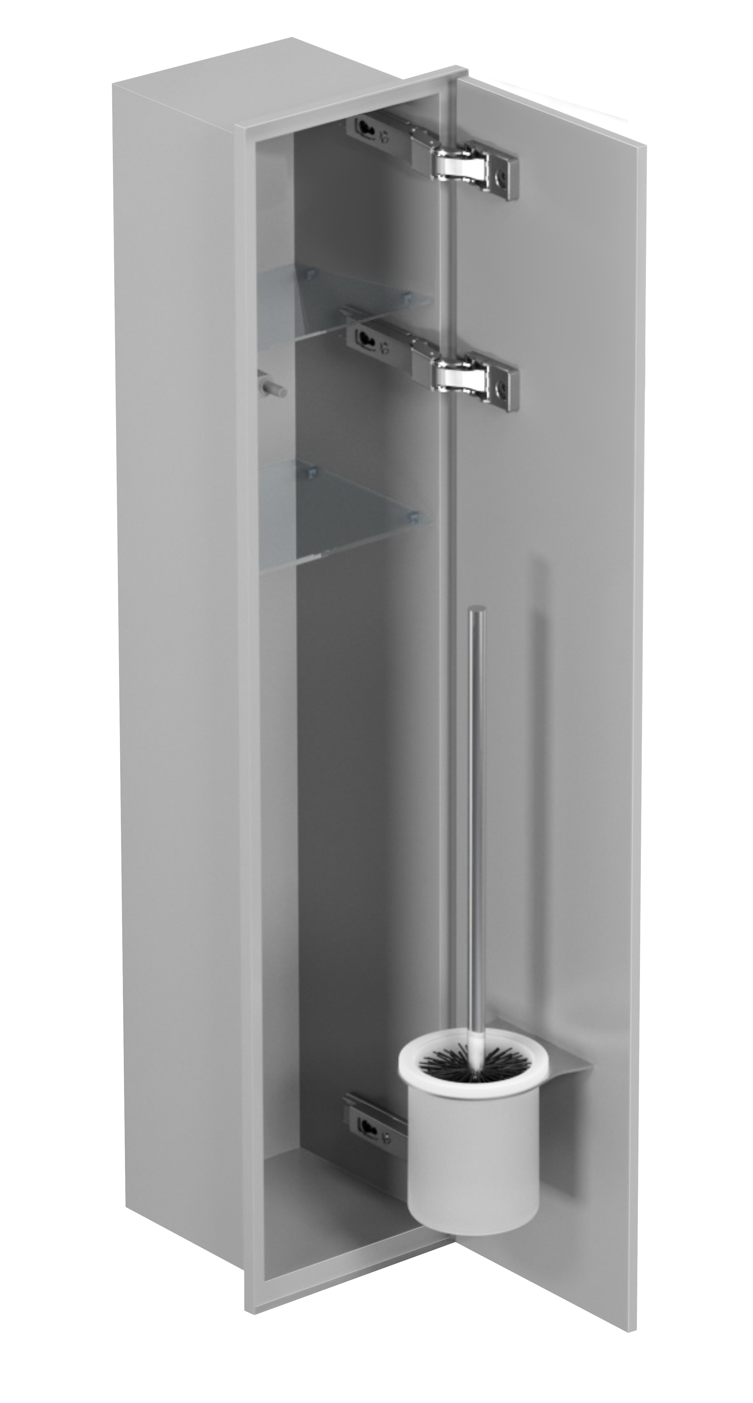 Schowek do szczotki i papieru toaletowego do zabudowy 18,5x83,5x15 cm MCJ to idealna propozycja dla nowoczesnych łazienek oraz osób, które cenią sobie dużą przestrzeń. Szafka łazienkowa wykonana ze stali nierdzewnej i przeznaczona jest do przechowywania szczotki i papieru toaletowego. Wnętrze szafki wyposażone zostało w półki z bezpiecznego szkła. Szafka łazienkowa do zabudowy zamykana jest na jednoczęściowe drzwiczki wykonane również ze stali nierdzewnej. Szafka wyposażona została w dwie półeczki i dopasowany schowek na szczotkę. Na drzwiach istnieje również możliwość położenia płytek, dzięki czemu drzwi wyglądają tak samo jak ściana. W środku jedna wolna półeczka do dowolnego zagospodarowania. Szafka posiada kołnierz typu Zero, co oznacza, że szafka nie wystaje poza ścianę. W opcjach należy wybrać stronę otwierania. Kaczucha.pl łazienki z gwarancją jakości.