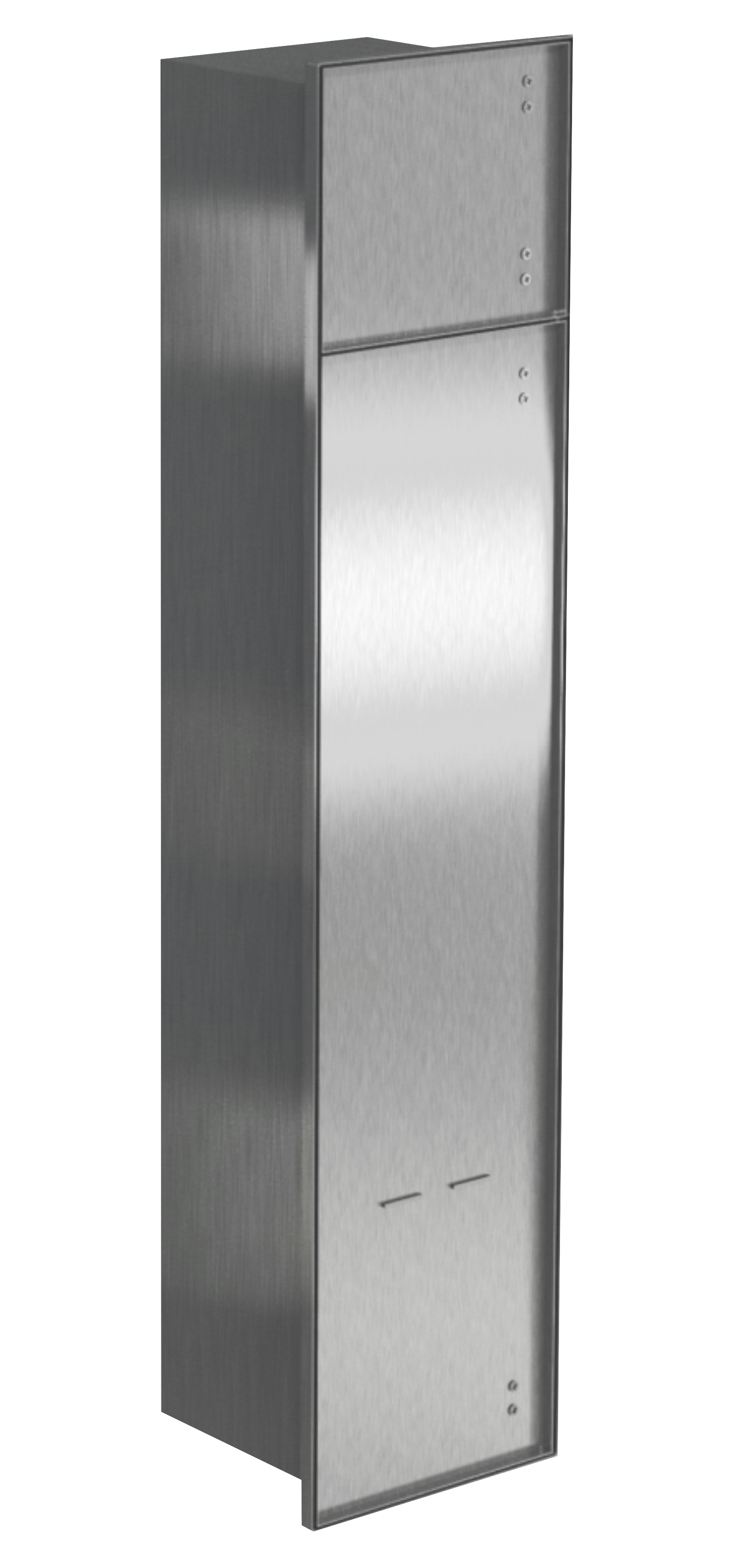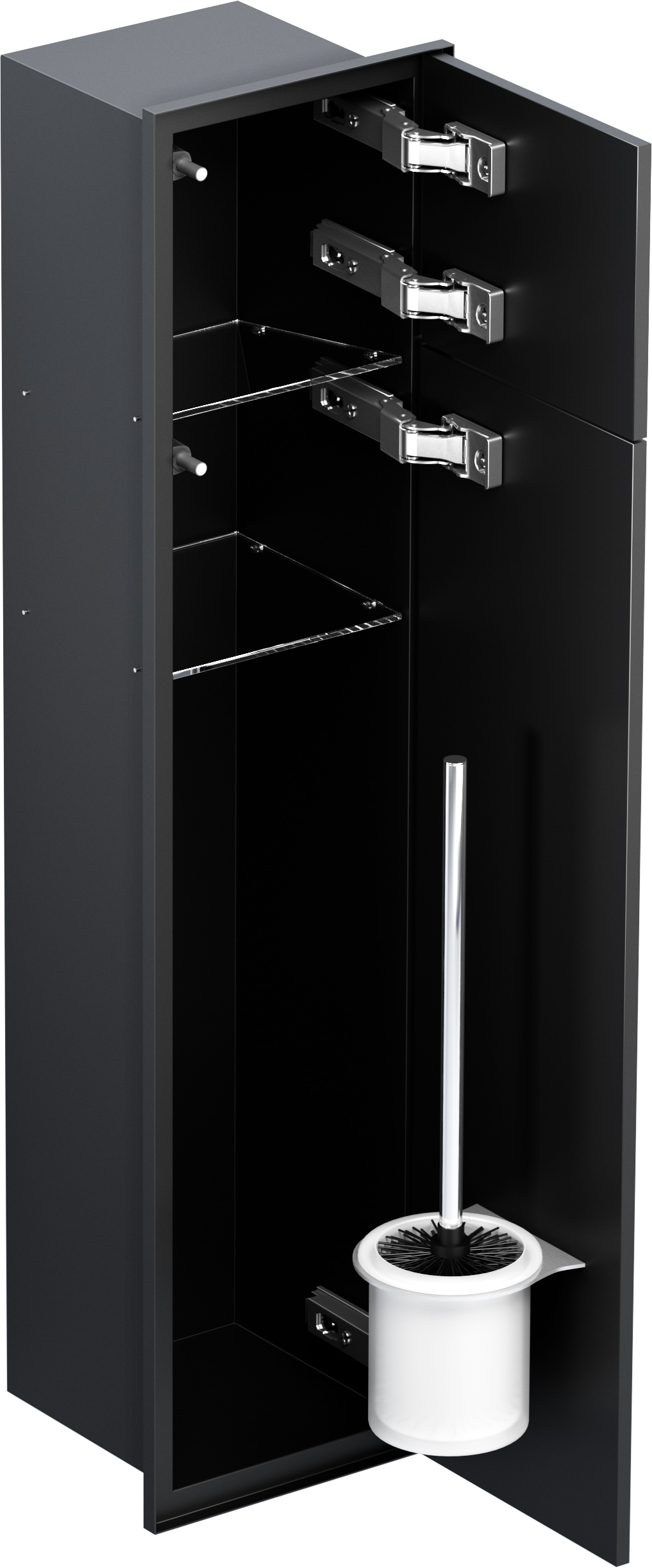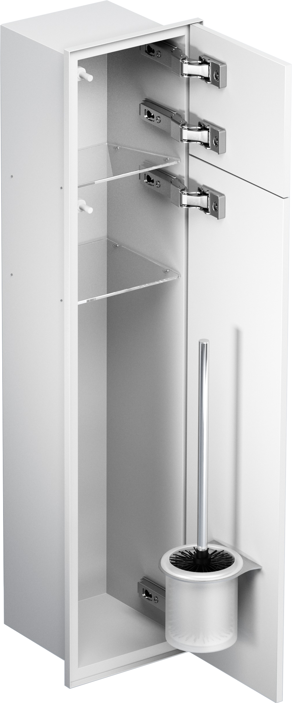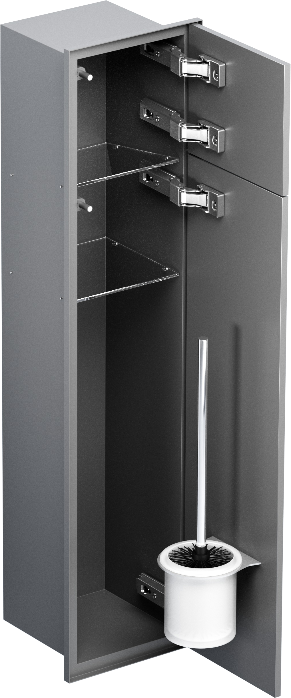 Schowek podtynkowy WC o wymiarach 18x83x16 cm to funkcjonalne i nowoczesne rozwiązanie zaprojektowane z myślą o estetyce i wygodzie użytkowania. Wykonany z trwałej stali nierdzewnej, przeznaczony do zabudowy kafelkami, idealnie wtapia się w powierzchnię ściany, zapewniając minimalistyczny wygląd łazienki. Kołnierz typu Zero umożliwia zlicowanie schowka ze ścianą, tworząc spójną i elegancką aranżację. Wnętrze schowka WC jest starannie zaprojektowane, by pomieścić szczotkę WC i papier toaletowy, oferując praktyczne rozwiązanie do każdej łazienki. Wnętrze szafki wyposażone zostało w półki z bezpiecznego szkła. Szafka łazienkowa do zabudowy zamykana jest na drzwiczki wykonane również ze stali nierdzewnej. Osobno zamykana jest górna, niewielka półka na papier toaletowy oraz szafka z dwiema półkami, w tym jedna na szczotkę WC.