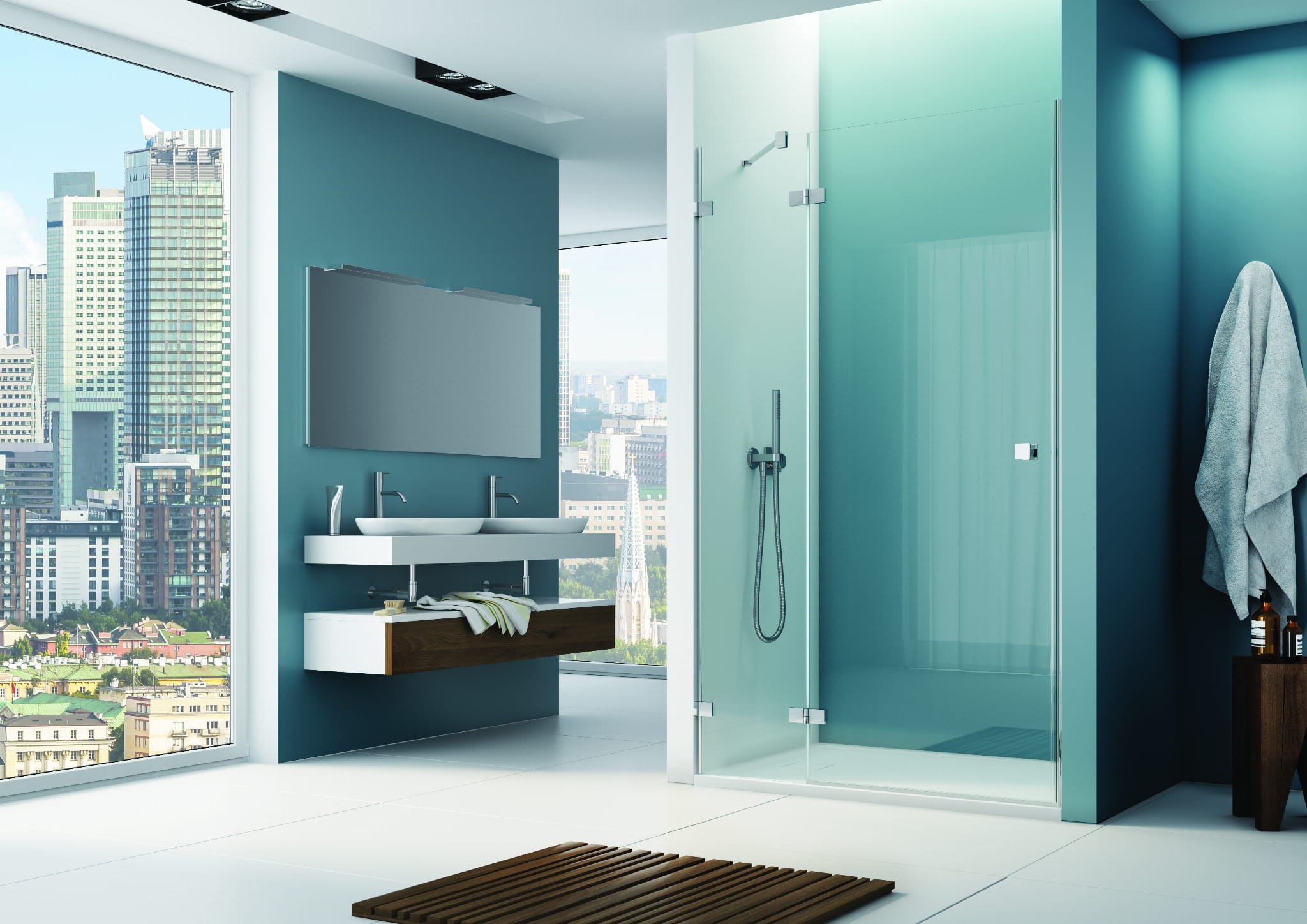 Wysoka wygoda pielęgnacji. Drzwi prysznicowe wnękowe, dzięki zastosowanej powłoce AquaPerle na szkle, pozwalają wodzie spływać po powierzchni w formie pojedynczych kropli, co skutecznie ogranicza gromadzenie się zanieczyszczeń. Powłoka AquaPerle ułatwia codzienną pielęgnację i zachowanie kabiny w nienagannej czystości, zapewniając jednocześnie długotrwałą przezroczystość szkła.
