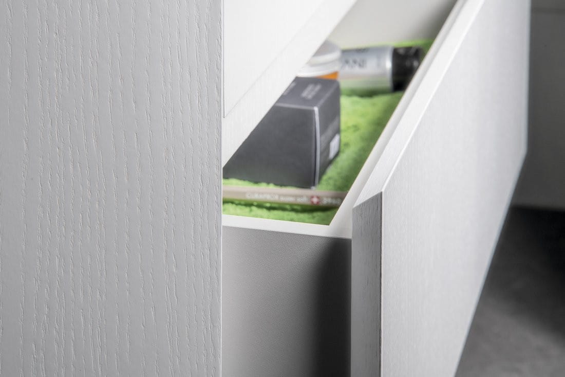Szuflady naszych mebli wyposażone są w prowadnice z systemem powolnego i cichego domyku. Wystarczy jedno pchnięcie i szuflada domknie się sama, cicho i delikatnie.