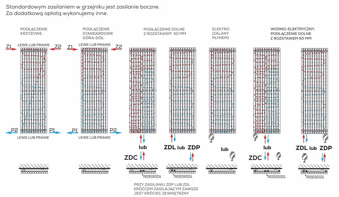 standardowym podłączeniem jest podłączenie boczne, istnieje możliwość wykonania z podłączeniem od dołu z rozstawem 50 mm lub innymi standardowymi podłączeniami
