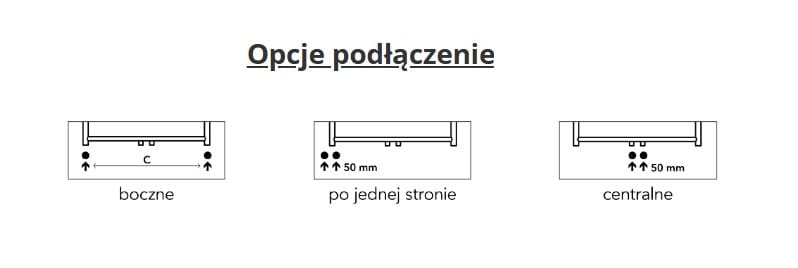 Podłączenie boczne lub centralne. Grzejnik drabinkowy wyposażony jest w boczne przyłącza oraz umożliwia montaż po jednej lub z obu stron. Dodatkowo można podłączyć centralnie. Przeznaczony jest do systemów wodnych oraz mieszanych. Aby korzystać z trybu mieszanego, należy dokupić odpowiednie zawory i grzałkę elektryczną.