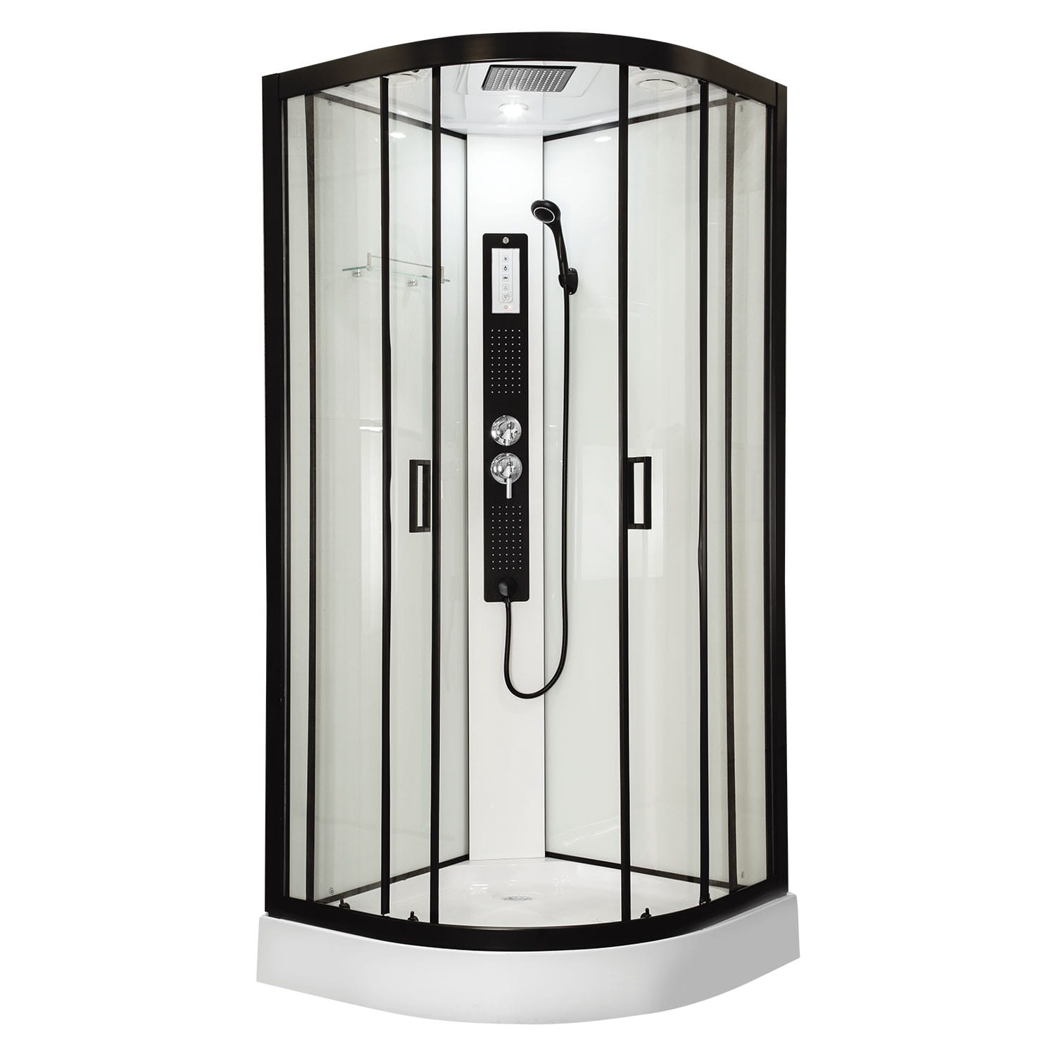 Półokrągła kabina natryskowa hydromasażowa 90x90 cm Kerra Petrus to wyjątkowa propozycja dla osób, które marzą o relaksie bez wychodzenia z domu. Kabina prysznicowa z hydromasażem zapewni wyjątkowy komfort podczas prysznica a funkcja hydromasażu dostarczy wyjątkowej przyjemności. W komplecie z kabiną znajduje się brodzik akrylowy, niski, w kolorze białym. Kabina natryskowa wyposażona została w hydromasaż składający się z 2 sekcji po 50 dysz punkowych, natrysku górnego i ręcznego. Kabina prysznicowa półokrągła 90x90 cm posiada drzwi dwuskrzydłowe, przesuwne. Kabina prysznicowa wykonana z transparentnego szkła hartowanego o grubości 4 mm. Profile w kabinie wykonane zostały w kolorze czarnym, co również podkreśla nowoczesny charakter kabiny. Kabina prysznicowa z hydromasażem wyposażona jest w słuchawkę prysznicową z wężem w kolorze czarnym. Zaletą kabiny prysznicowej są dodatkowe funkcje takie jak radio oraz oświetlenie. Kabina prysznicowa pozwala na wyjątkowe chwile relaksu. Woda delikatnie masuje ciało dając odprężenie. W kabinie hydromasażowej możesz relaksować się i słuchać muzyki. Kabina hydromasażowa szczególnie przypadnie do gustu osobom poszukującym relaksu po ciężkim dniu. Wyjątkowa, wielofunkcyjna kabina prysznicowa to świetne rozwiązanie zarówno do salonów kąpielowych jak i mniejszych łazienek. Kaczucha.pl nowoczesność i komfort!