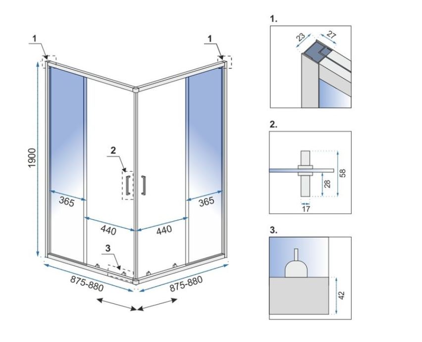Montaż narożny. Kabina prysznicowa przeznaczona jest do montażu w narożniku łazienki. Może być instalowana zarówno na brodziku prysznicowym, jak i bezpośrednio na posadzce z odpływem liniowym. Regulacja profili ułatwia dopasowanie kabiny do nierówności ścian podczas montażu.