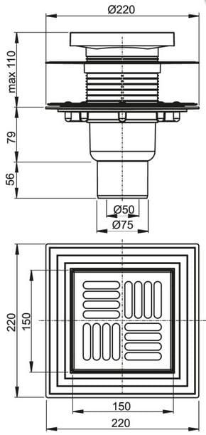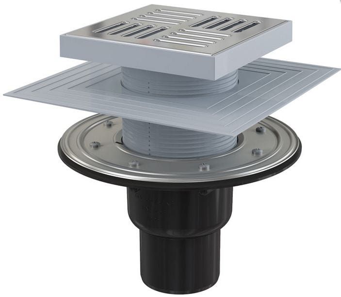 Kratka ściekowa podłogowa ALCA APV4444 wykonana z wysokiej jakości stali nierdzewnej bardzo dobrze sprawdza się w mieszkaniach, hotelach, szkołach, umywalniach publicznych i natryskach. Kratka jest wykonana zgodnie z normami europejskimi i spełnia wymagania dotyczące bezpiecznego chodzenia boso. Konstrukcja odpływu zapewnia łatwy dostęp i czyszczenie. W skład zestawu wchodzą: korpus odpływ pionowy Ø50/75 mm, gardziel wlotu 150×150 mm, kratka wlotowa ze stali nierdzewnej, syfon mokry, syfon suchy, kołnierz ze stali nierdzewnej + zestaw montażowy, kołnierz 2. poziom izolacji wewnętrzny Ø105 mm, zestaw uszczelniający