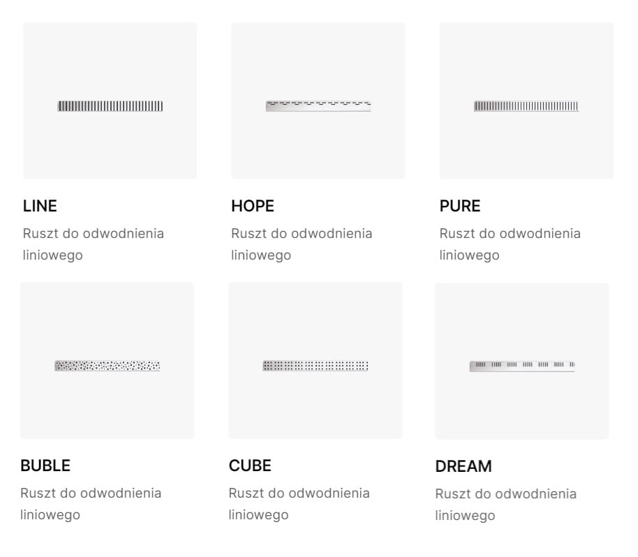 Duży wybór rozmiarów odpływu i wzorów rusztu! Odpływ liniowy z rusztem dostępny jest w wielu wymiarach. Wybierz w opcjach: 55 cm, 65 cm, 75 cm, 85 cm, 95 cm, 105 cm i 115 cm. W galerii znajdziesz również inne efektowne ruszty. Możliwe jest wykonanie odpływu w niestandardowym wymiarze - zapytaj w sklepie.