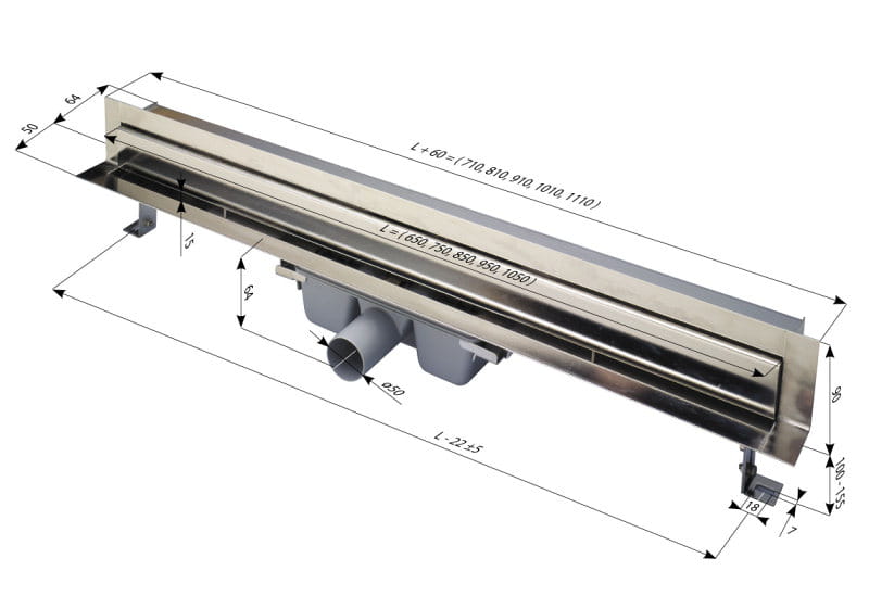 Duży wybór rozmiarów odpływu! Odpływ liniowy z rusztem dostępny jest w wielu wymiarach. Wybierz w opcjach: 65 cm, 75 cm, 85 cm, 95 cm i 105 cm.