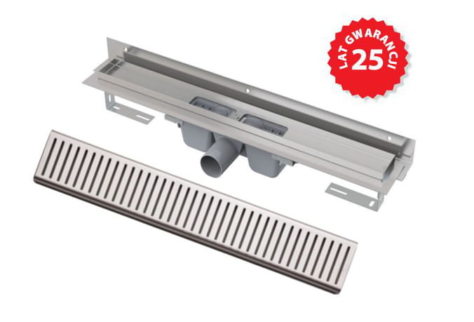 Wyposażenie: W komplecie z odpływem liniowym znajduje się syfon, zestaw montażowy, samoprzylepna taśma uszczelniająca, pokrywa instalacyjna, ozdobny ruszt Pure ze stali nierdzewnej z połyskiem.