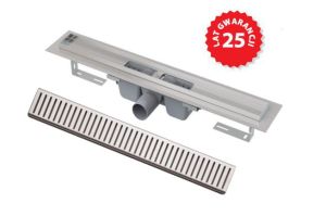 Wyposażenie: W komplecie z odpływem liniowym znajduje się syfon, zestaw montażowy, samoprzylepna taśma uszczelniająca, pokrywa instalacyjna, ozdobny ruszt ze stali nierdzewnej.