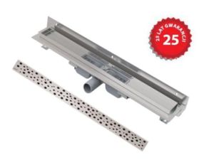 Wyposażenie: W komplecie z odpływem liniowym znajduje się syfon, zestaw montażowy, samoprzylepna taśma uszczelniająca, pokrywa instalacyjna, ozdobny ruszt ze stali nierdzewnej, z połyskiem.