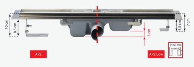 Odpływ wykonany ze stali nierdzewnej. Odpływ liniowy wykonany został z wysokiej jakości, hartowanej stali nierdzewnej. Odpływ jest wyjątkowo wytrzymały i odporny na uszkodzenia, dzięki czemu można go użytkować przez długie lata. Do rynny odpływu zamontowany jest dwukomorowy syfon, co z kolei zapewnia 100% szczelności oraz niezwykle wydajny odbiór wody z natrysku do kanalizacji. Zaletą system jest łatwość w odseparowaniu większych nieczystości takich jak np. włosy. Specjalna konstrukcja pozwala na dotarcie z góry do samej rury odpływowej, dzięki czemu odpływ prysznicowy Alcadrain zapewnia długie działanie bez potrzeby czyszczenia i przetykania.