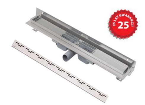 Wyposażenie: W komplecie z odpływem liniowym znajduje się syfon, zestaw montażowy, samoprzylepna taśma uszczelniająca, pokrywa instalacyjna, ozdobny ruszt ze stali nierdzewnej, z połyskiem.