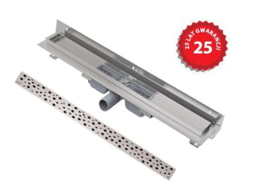 Wyposażenie: W komplecie z odpływem liniowym znajduje się syfon, zestaw montażowy, samoprzylepna taśma uszczelniająca, pokrywa instalacyjna, ozdobny ruszt ze stali nierdzewnej, z połyskiem.