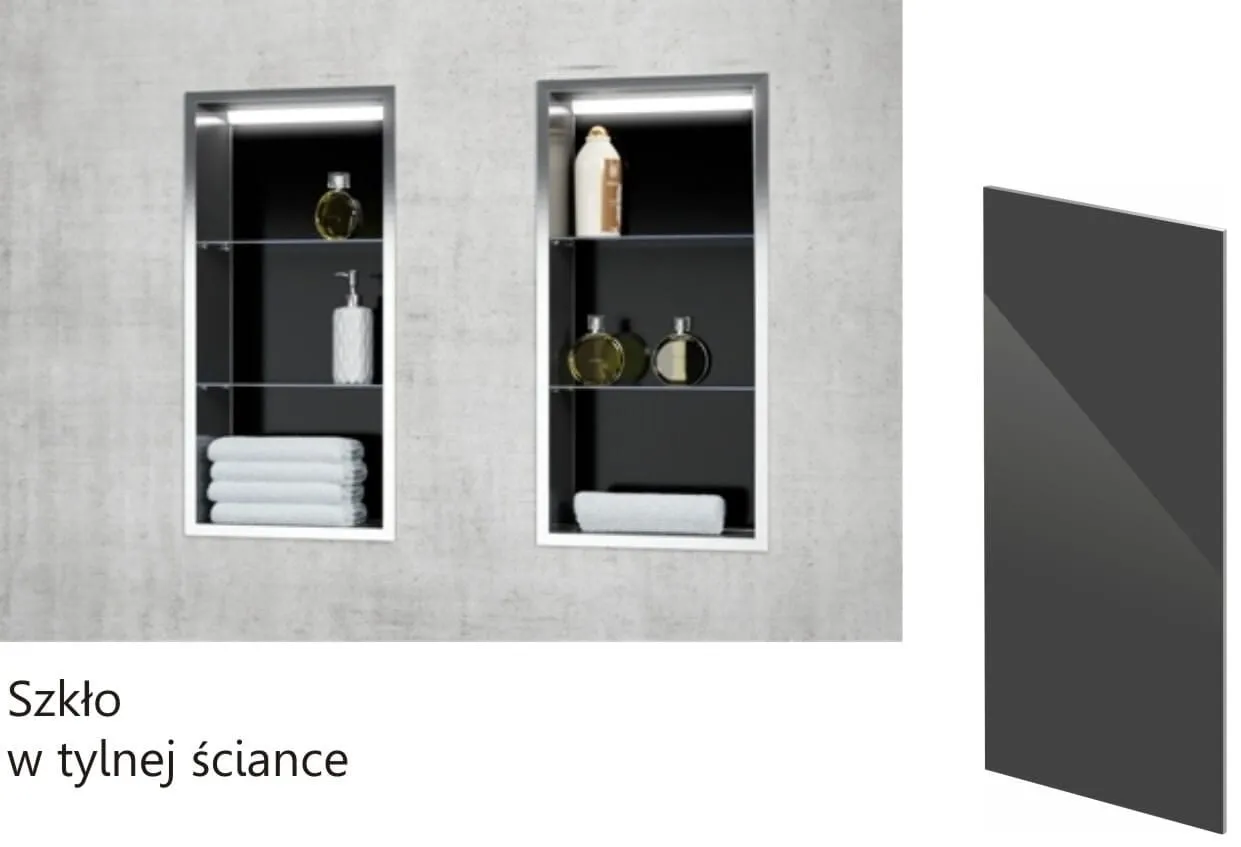 Półka łazienkowa wnękowa do zabudowy 32x92x15 cm ze stali nierdzewnej, malowanej proszkowo i szklaną półką MCJ F.PWNP LWH 900/15