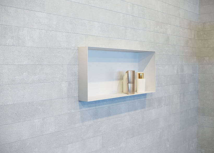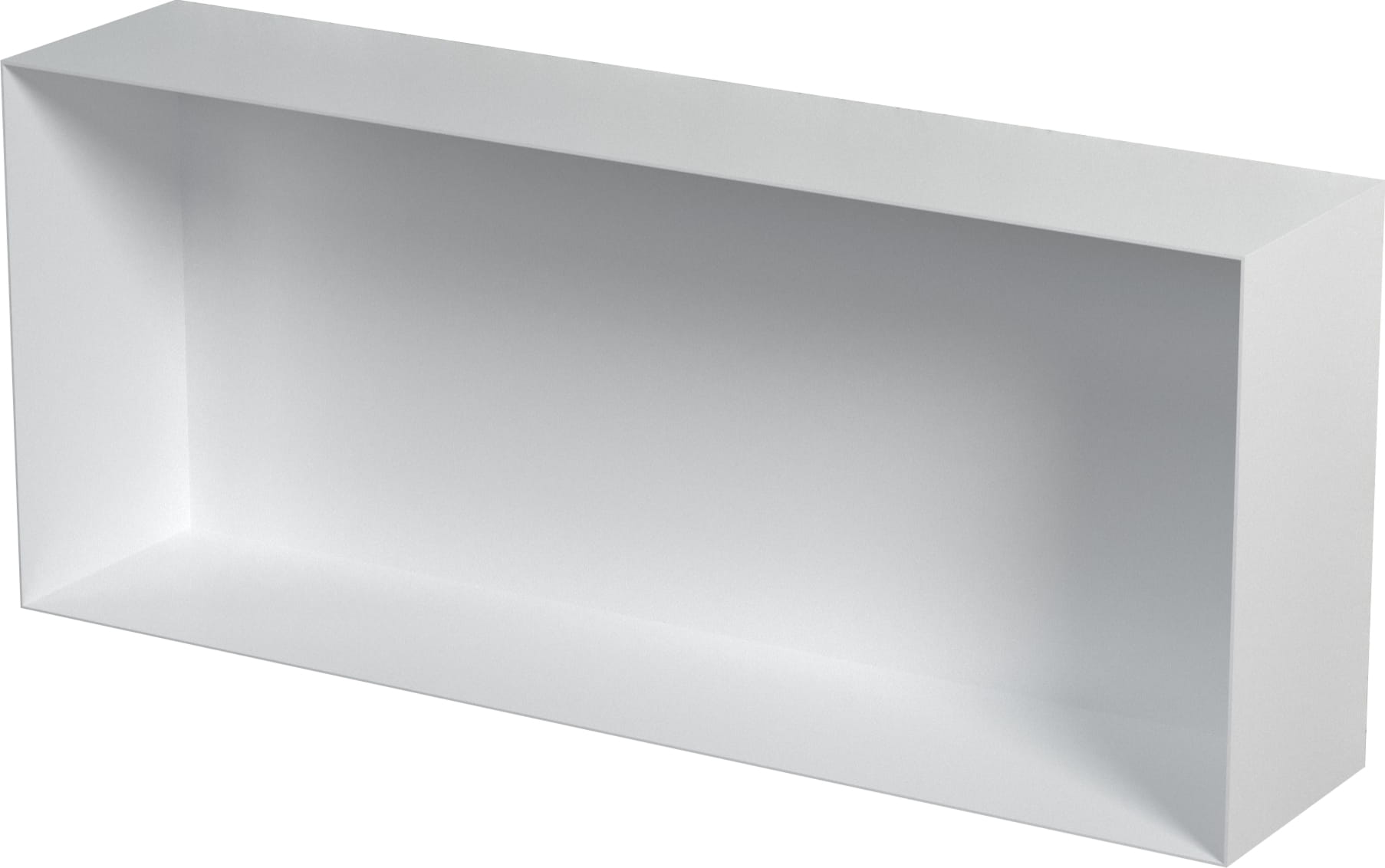 Półka łazienkowa wnękowa do zabudowy 32,5x92,3x10 cm ze stali nierdzewnej lakierowanej na kolor biały ze szklanymi półkami kołnierz typu Flat MCJ F.PWNP LWH 900/10