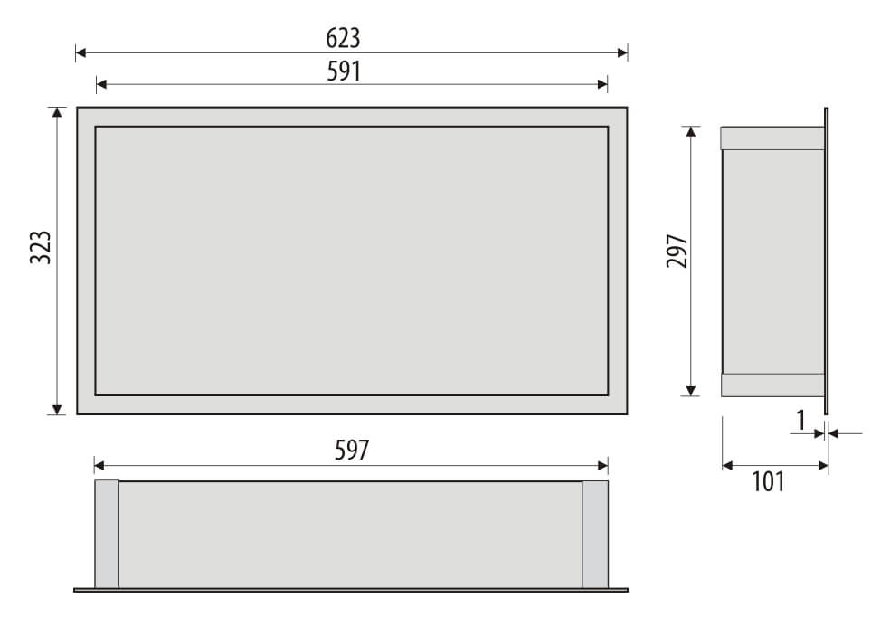 Półka łazienkowa wnękowa do zabudowy 62x32x15 cm ze stali nierdzewnej, lakierowanej na kolor szary, kołnierz typu Flat MCJ F.PWN LGR 600/15