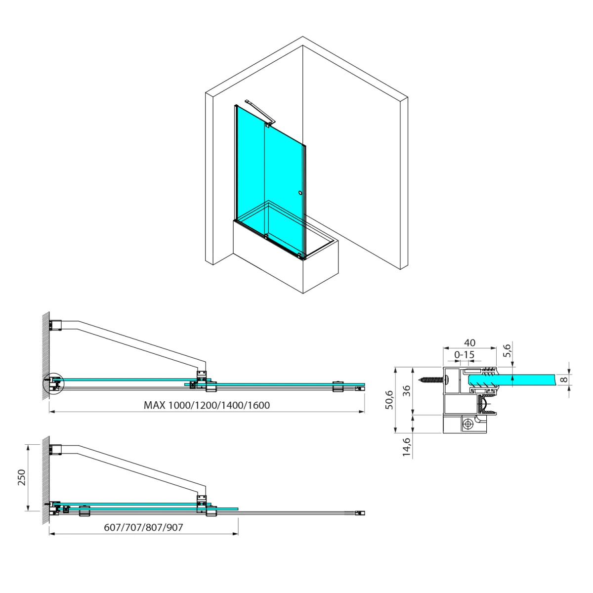ROLLS BLACK parawan wannowy 1200x1500mm, szkło czyste