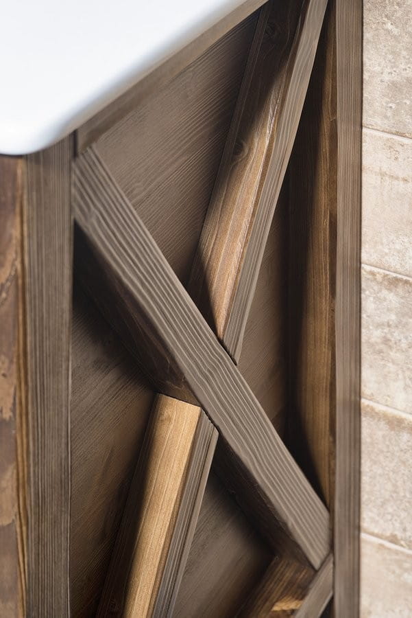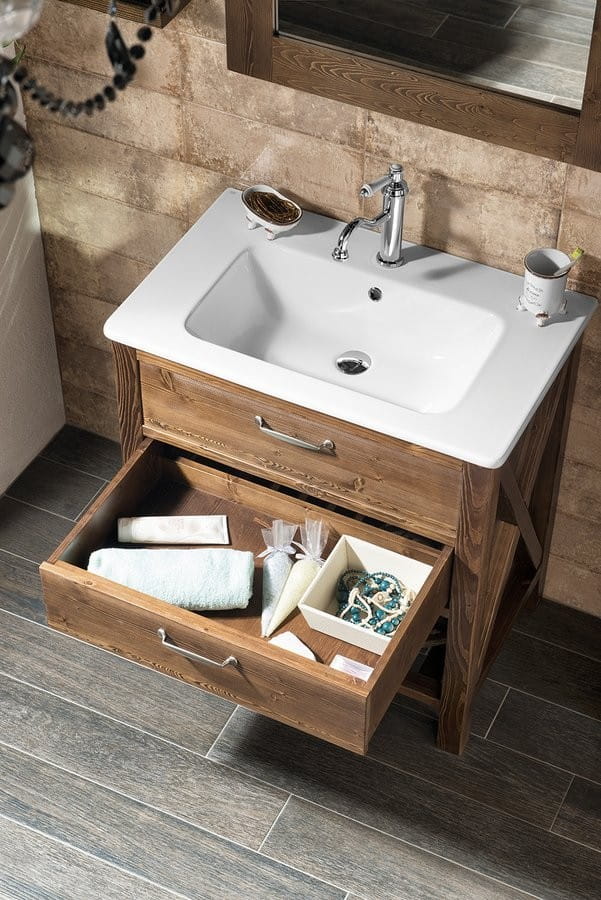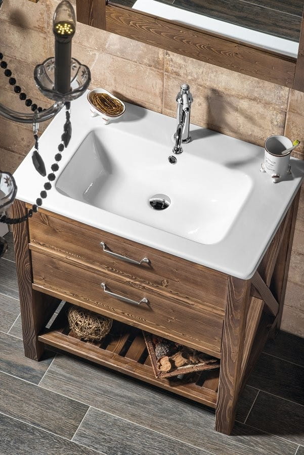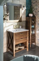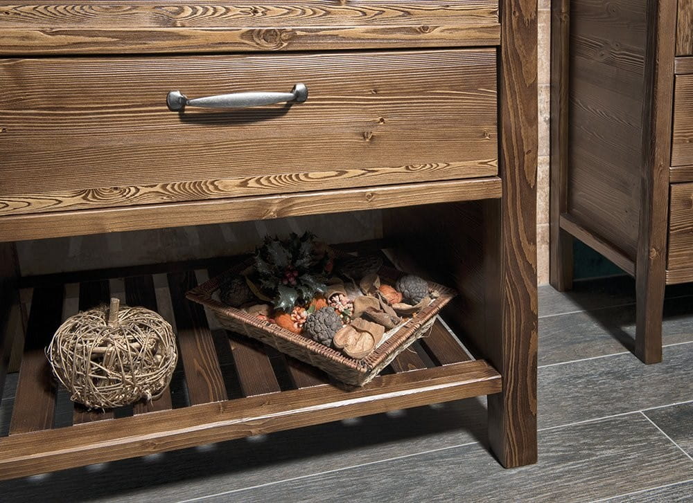 Zestaw WESTERN łączy szafkę z litego drewna z ceramiczną umywalką włoskiego producenta GSI. W szafkach dominują masywne nogi i ozdobny krzyż po bokach. Szuflady z miękkim zamknięciem są wyposażone w szuflady HETTICH i można wybrać jeden z dwóch rodzajów uchwytów - srebrny i antyczny brąz.
