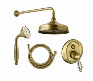 Wyposażenie – elegancki zestaw w komplecie: deszczownica, słuchawka ręczna, wąż, uchwyt i przyłącze. W zestawie prysznicowym Retro znajduje się podtynkowa bateria prysznicowa z uchwytem Swarovski, deszczownica Ø20 cm wraz z ramieniem, ręczna słuchawka prysznicowa z białą rączką, elastyczny wąż, uchwyt punktowy oraz przyłącze kątowe. Każdy element utrzymany jest w spójnej stylistyce Retro, dzięki czemu tworzą harmonijną i luksusową całość.