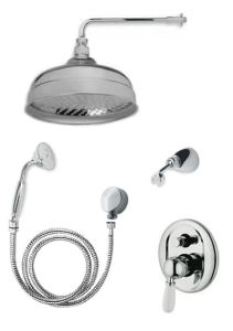 Wyposażenie. Zestaw prysznicowy w stylu Retro składa się z wysokiej jakości deszczownicy z ramieniem, słuchawki prysznicowej z wężem, uchwytem i przyłączem oraz z baterii prysznicowej podtynkowej. Deszczownica Retro posiada okrągłą formę o średnicy 20 cm. Razem z deszczownicą Retro w zestawie znajduje się ramię ścienne. Do stylu Retro nawiązuje również efektowny kształt słuchawki prysznicowej. Dodatkowo słuchawka prysznicowa Retro wyposażona została w wąż prysznicowy, uchwyt oraz przyłącze do wody. Sterowanie urządzeniami umożliwia bateria podtynkowa z przełącznikiem. Styl Retro baterii podkreśla efektowny ceramiczny uchwyt w kolorze kości słoniowej. Ceramiczny uchwyt posiada bateria prysznicowa podtynkowa.