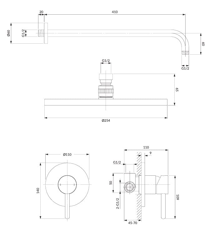 Wyposażenie. Zestaw prysznicowy wyposażona jest w deszczownicę okrągłą o średnicy 25 cm oraz baterię, sterującą deszczownicą.