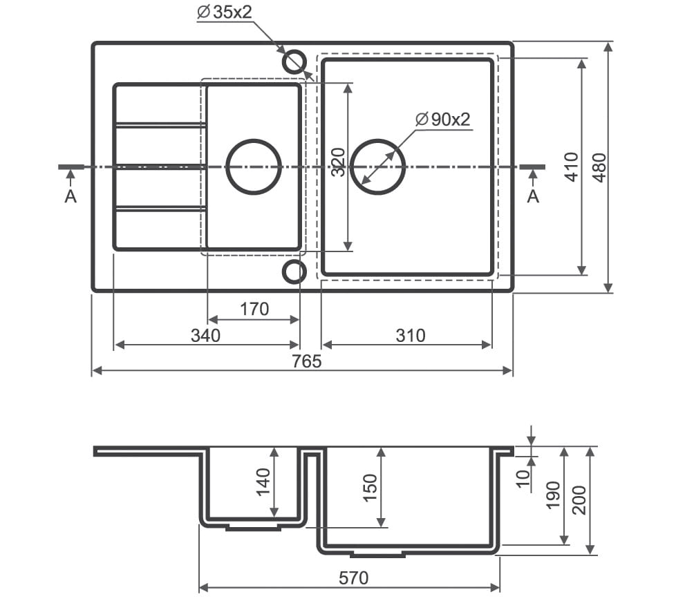 Montaż na szafce lub do wpuszczenia w blat. Zlew przeznaczony jest do montażu poprzez wpuszczenie w blat lub do montażu na szafce (minimalna szerokość szafki 60 cm).