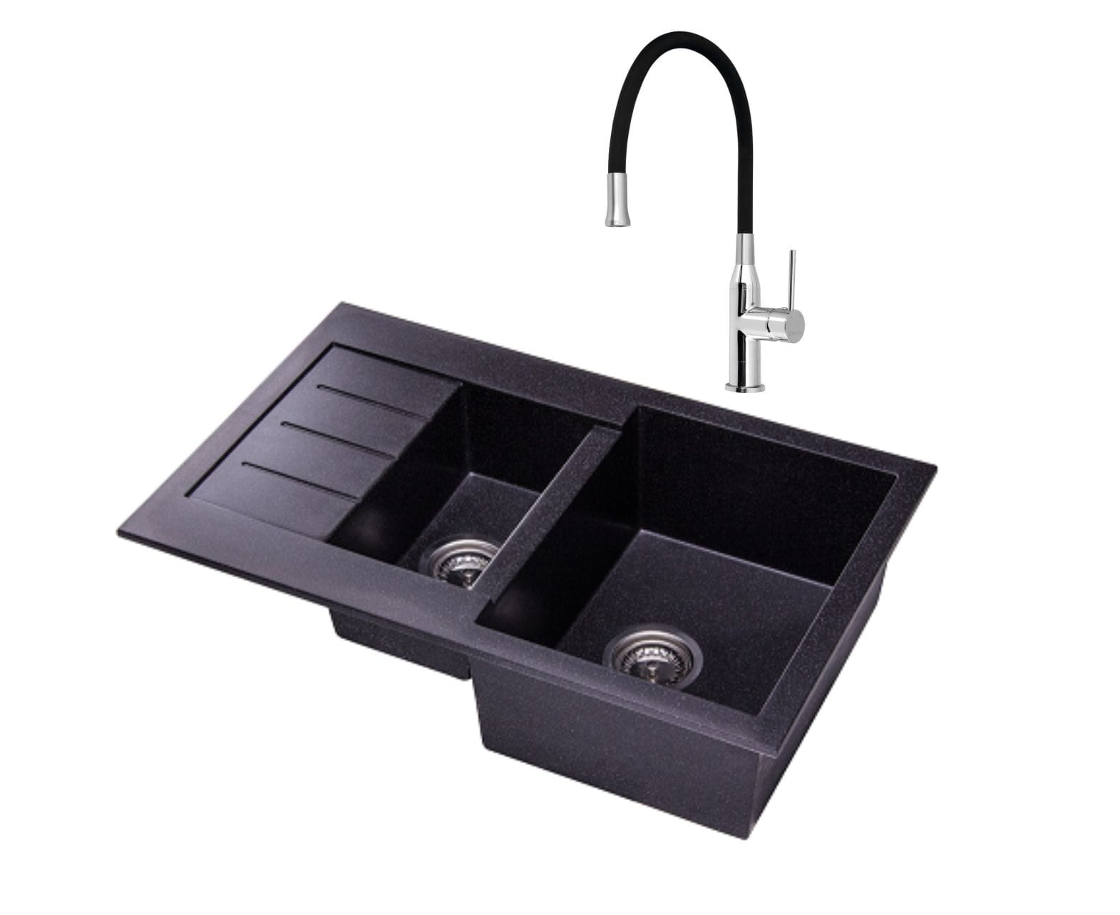 Komplet zlew kuchenny dwukomorowy Darfor z baterią kuchenną Sili - Zlewozmywak granitowy dwukomorowy wyróżnia się designerską, minimalistyczną formą i modnym, czarnym kolorem. Zlew granitowy posiada dwie, praktyczne komory: duża 31x41 i mała 17x32 cm. Dodatkowo zlew wyposażony jest w niewielki ociekacz. Zlew granitowy to genialne połączenie designu i funkcjonalności. Zaletą zlewozmywaka jest łatwość i prostota czyszczenia. Zlewozmywaki granitowe są nie tylko praktycznym, ale także eleganckim dodatkiem do Twojego domu.