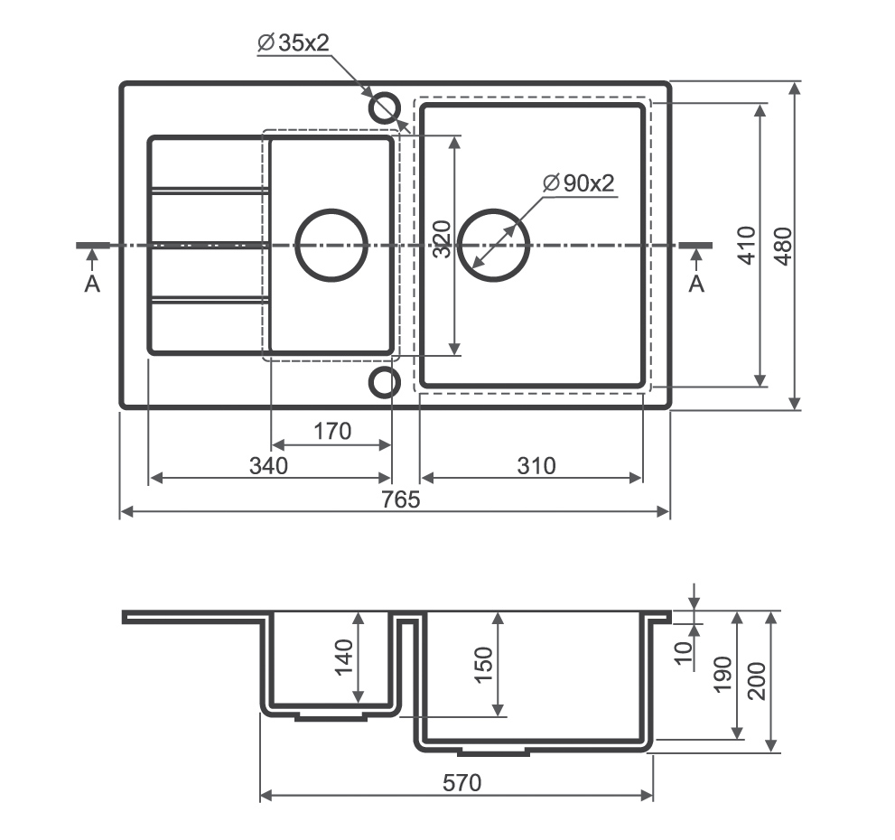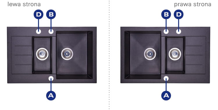 - zlew bez otworów na baterię. Standardowo otwór B jest przeznaczony do baterii, D do dozownika, A do pokrętła od syfonu automatycznego. Podczas zakupu należy wybrać stronę montażu i który otwór ma być wykonany - napisz w uwagach