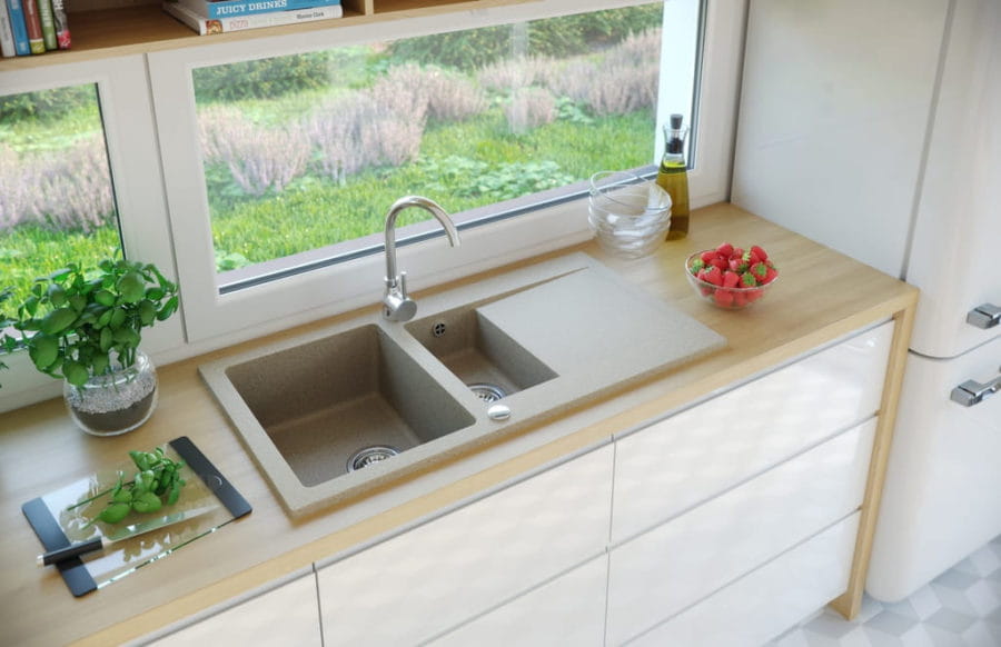 Zlew z granitu. Zlew kuchenny zrobiony jest z kruszywa granitowego w 80%. Głównymi zaletami użytego materiału jest wyjątkowa wytrzymałość na plamy i uszkodzenia mechaniczne. Zlewozmywak granitowy jest idealnym wyborem do kuchni często użytkowanych, zapewniając długotrwałe i bezproblemowe użytkowanie przez wiele lat.