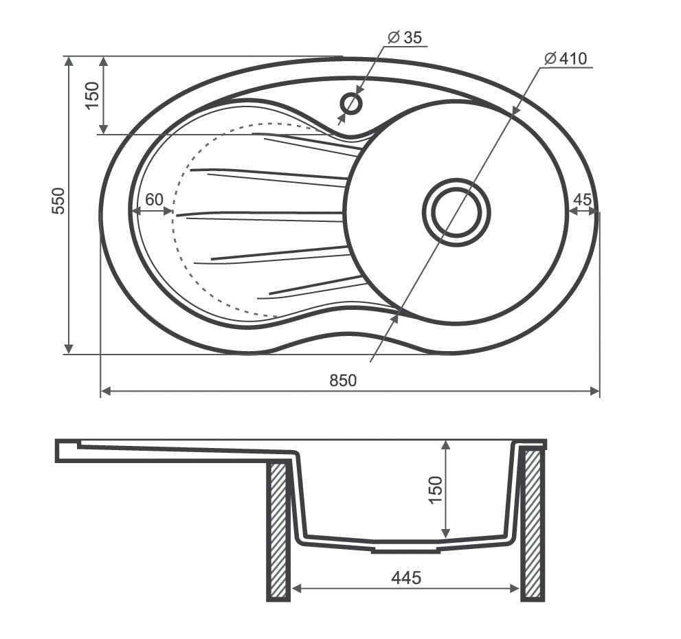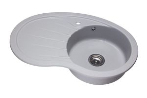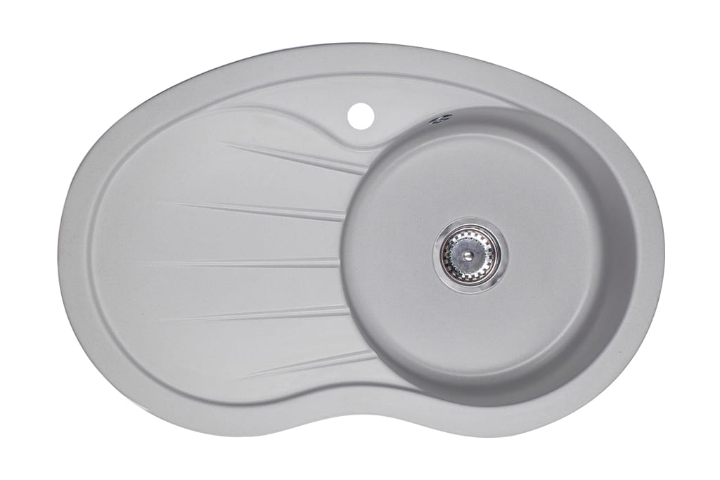 Szary zlewozmywak granitowy 85x55 cm Darfor. Zlewozmywak do kuchni wykonany z wysokiej jakości granitu prezentuje okrągłą, funkcjonalną komorę wyposażoną w praktyczny ociekacz. Zaskakuje on swoim nietypowym kształtem, który dodaje mu niepowtarzalnego charakteru. Jego nowoczesny styl, oparty na prostocie i eleganckim, subtelnie szarym odcieniu, harmonijnie współgra z różnorodnymi aranżacjami kuchennymi.