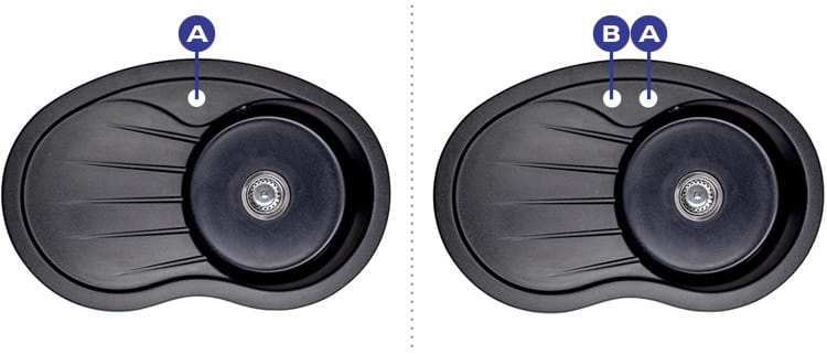 - zlewozmywak sprzedawany jest bez otworów, możliwość wykonania otworów na życzenie - otwór A - bateria, otwór B - pokrętło do syfonu automatycznego - napisz w uwagach przy zakupie zlewozmywaka