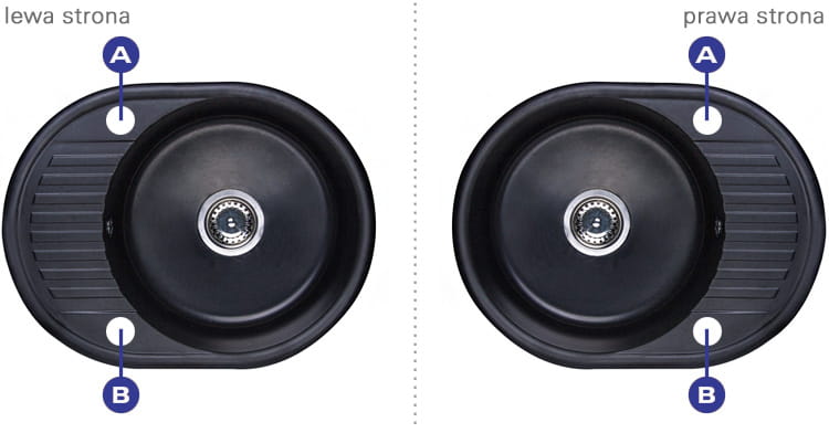 - standardowo otwór A jest przeznaczony do baterii, B do pokrętła od syfonu automatycznego lub dozownika. Podczas zakupu należy wybrać stronę montażu i który otwór ma być wykonany
