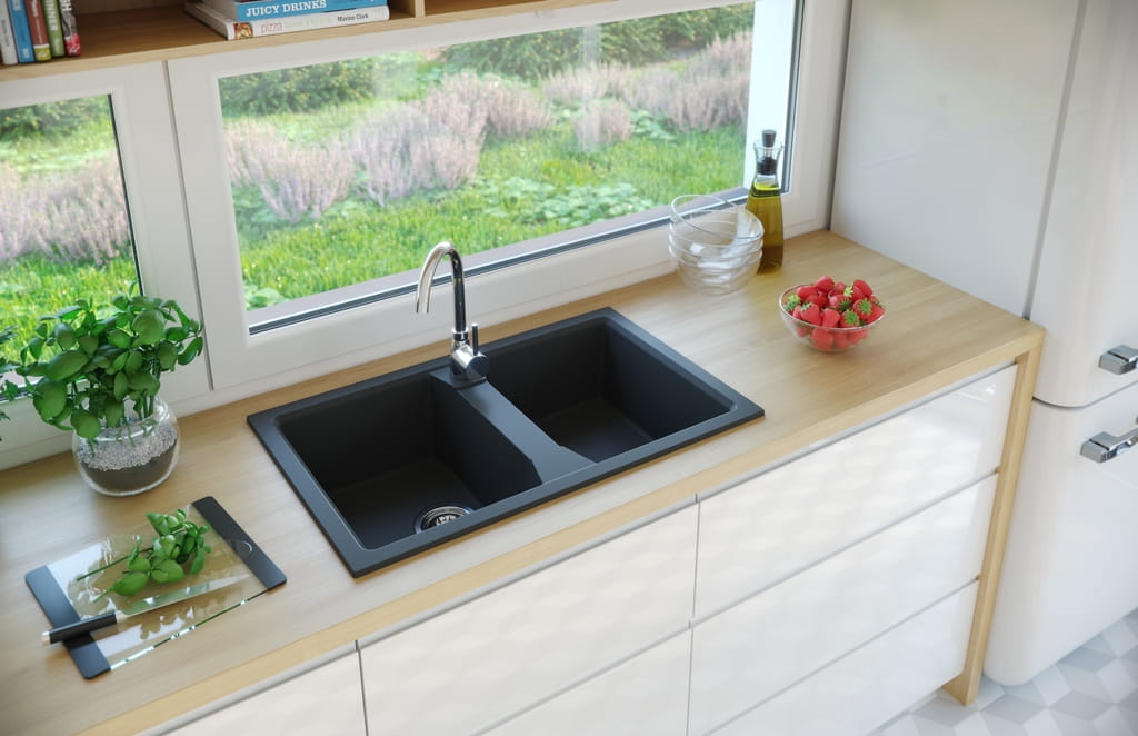 Zlewozmywak granitowy. Zlewozmywak wykonany z materiału, będącego mieszanką w 80% z kruszywa granitowego, zapewniającego trwałość i elegancję. Zlewozmywak granitowy jest odporny na plamy, dzięki czemu czyszczenie nie sprawia problemów. Ponadto, zlew kuchenny granitowy jest odporny na zarysowania i inne uszkodzenia. Oferuje nie tylko funkcjonalność, ale również estetyczne dopasowanie do różnych stylów wnętrz.