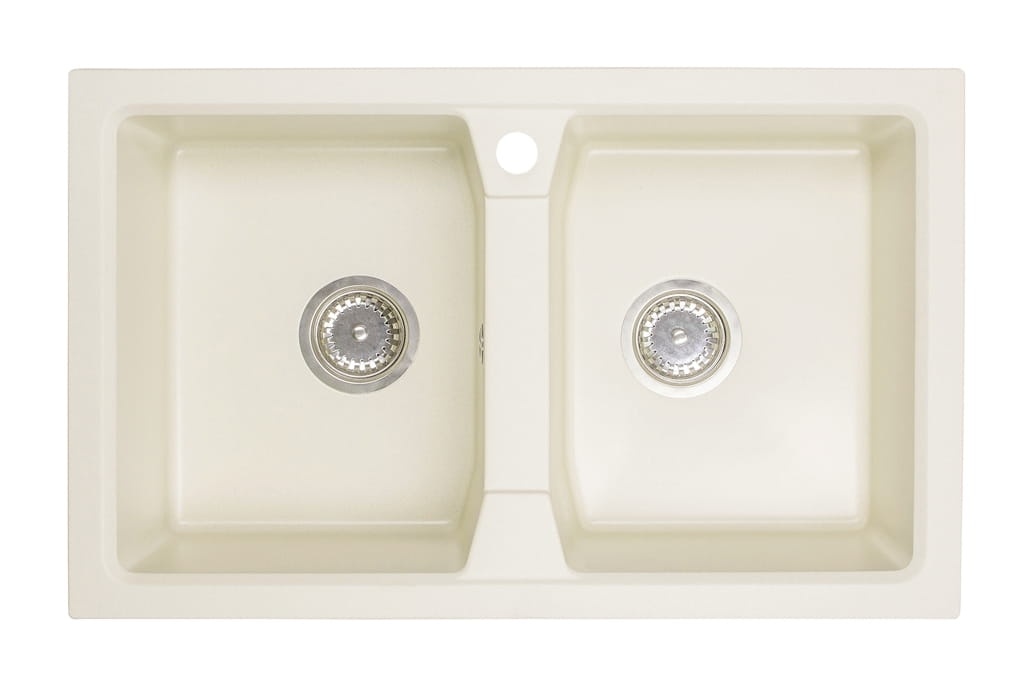 Zlewozmywak granitowy dwukomorowy 77x48 cm Darfor. Zlewozmywak wykonany z wysokiej jakości granitu został wyposażony w dwie praktyczne komory, ułatwiające wykonywanie codziennych czynności w kuchni. Pomiędzy nimi znajduje się specjalnie przeznaczone miejsce, które można wykorzystać na montaż baterii kuchennej. Jego nowatorski design, charakteryzujący się prostą, minimalistyczną formą i delikatnym, ciepłym odcieniem jaśminu, zapewnia idealne dopasowanie do różnorodnych aranżacji wnętrzowych.