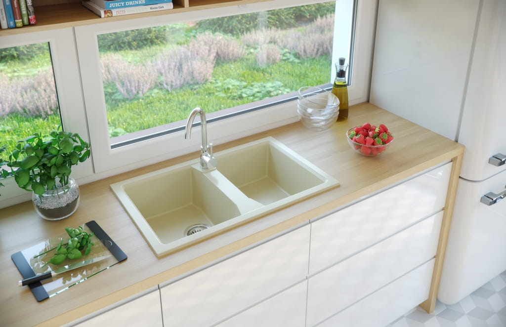 Zlewozmywak granitowy. Zlewozmywak wykonany z materiału, składającego się głównie z kruszywa granitowego (80%), zapewnia trwałość i elegancki wygląd. Zlewozmywak z granitu charakteryzuje się odpornością na plamy, co ułatwia utrzymanie go w czystości. Dodatkowo, zlew granitowy jest odporny na zarysowania i inne uszkodzenia, co gwarantuje jego długotrwałe użytkowanie. Zapewniając nie tylko funkcjonalność, ale także estetyczne dopasowanie do różnych stylów aranżacji wnętrzowych.