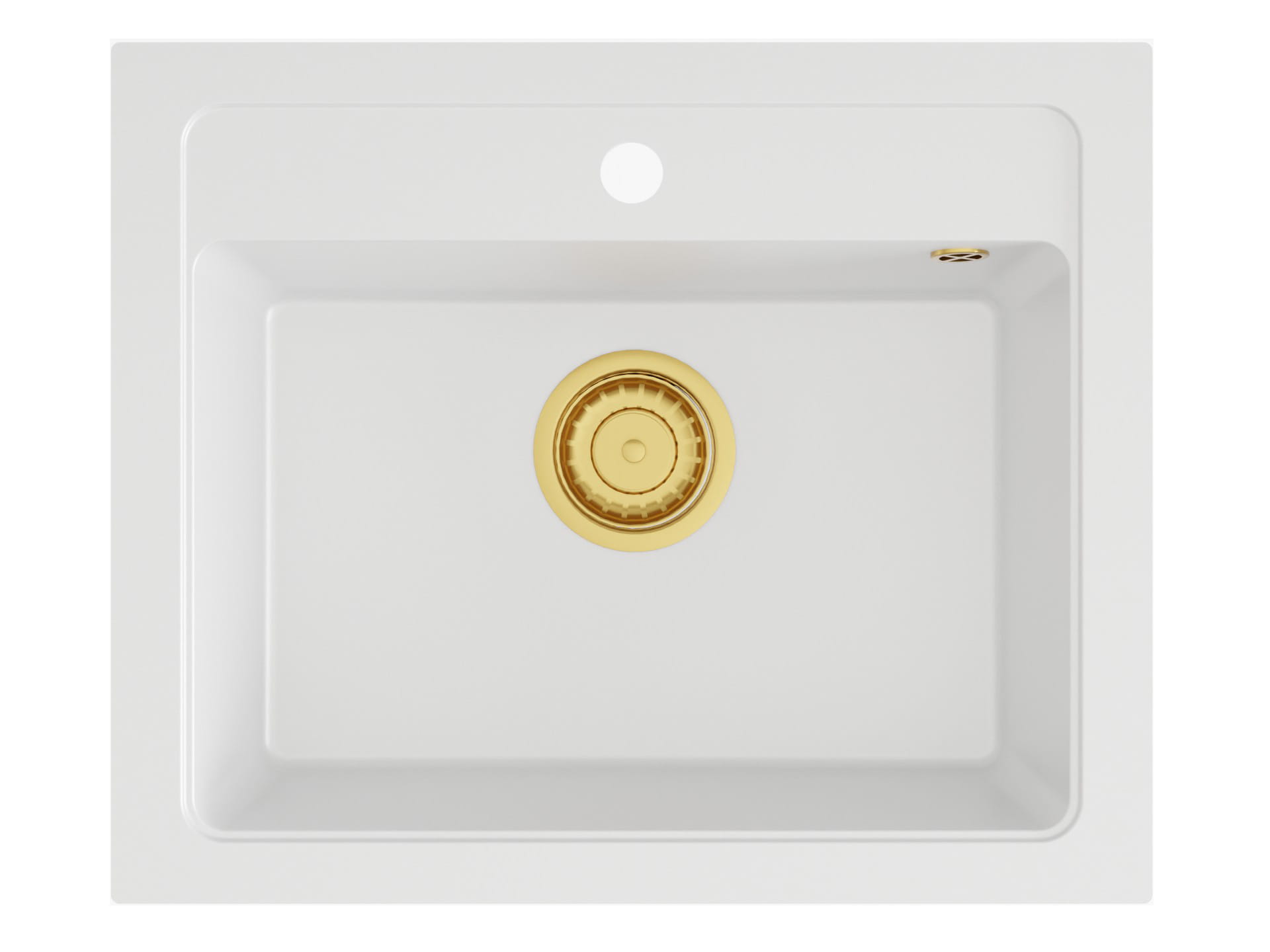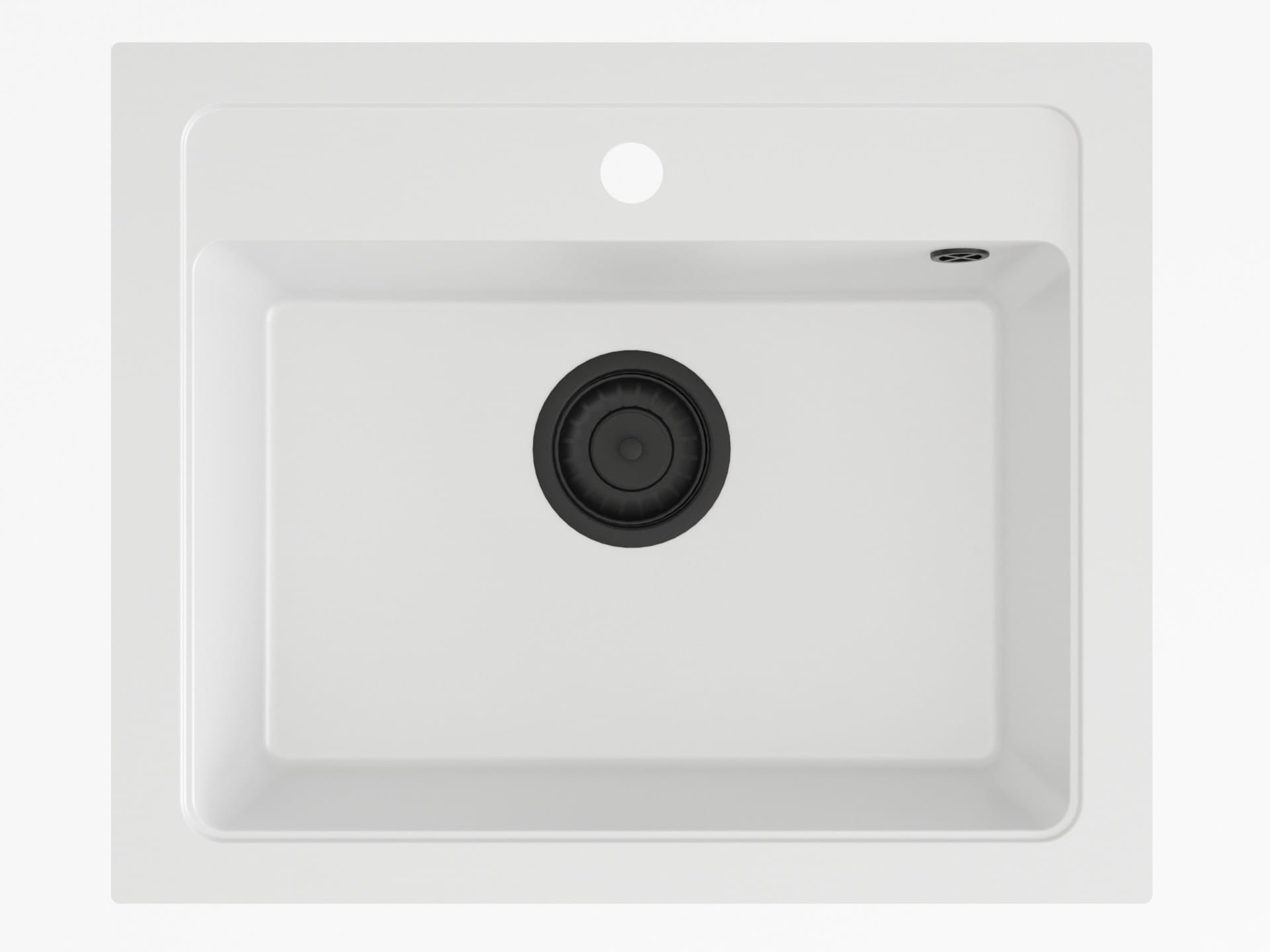 Zlew białego koloru. Zlew wykonany w delikatnym, białym kolorze. Dostępny jest również w innych kolorach: czarny, czarny nakrapiany, beż, jasny beż, grafit, popiel, jaśmin.